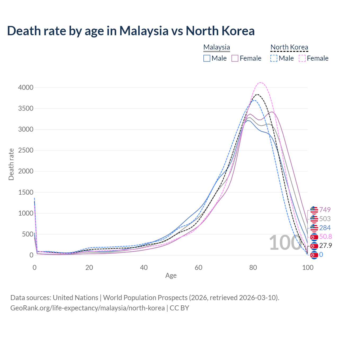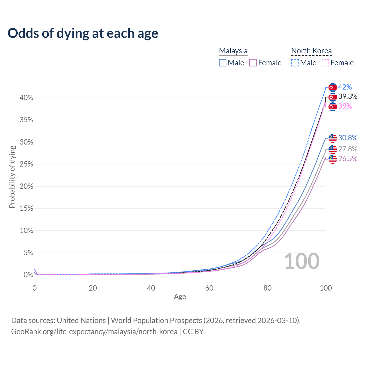 This life expectancy calculator shows the odds of living to 100, 95, 90, and below based on current age for both males and females in Malaysia and North Korea, along with mean and median age of death. The calculations are based on the 2026 life tables (actuarial tables) from the UN World Population Prospects.