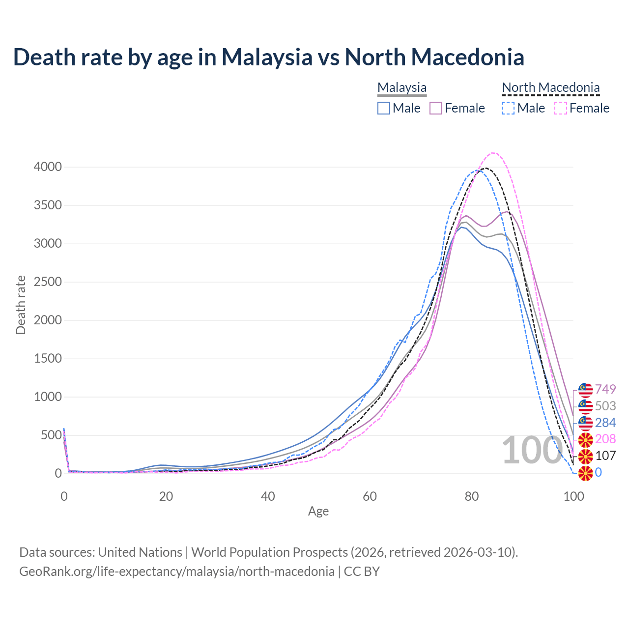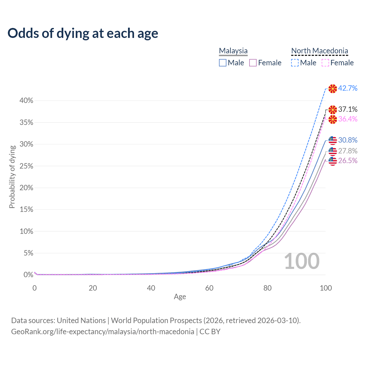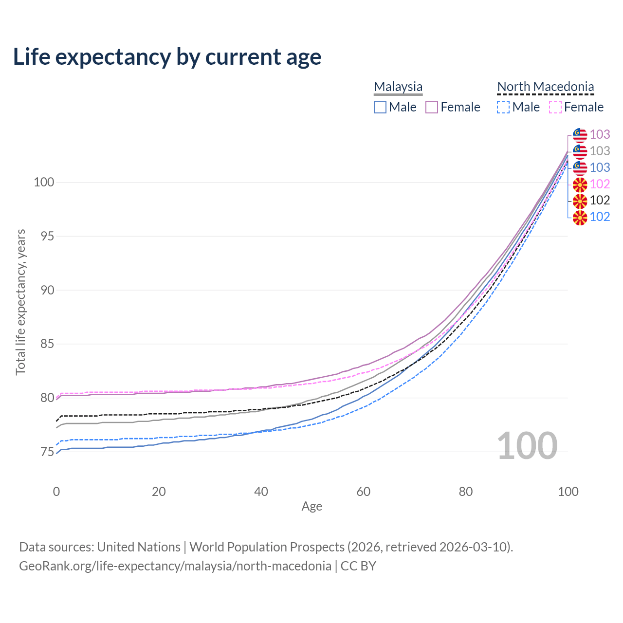 This life expectancy calculator shows the odds of living to 100, 95, 90, and below based on current age for both males and females in Malaysia and North Macedonia, along with mean and median age of death. The calculations are based on the 2026 life tables (actuarial tables) from the UN World Population Prospects.