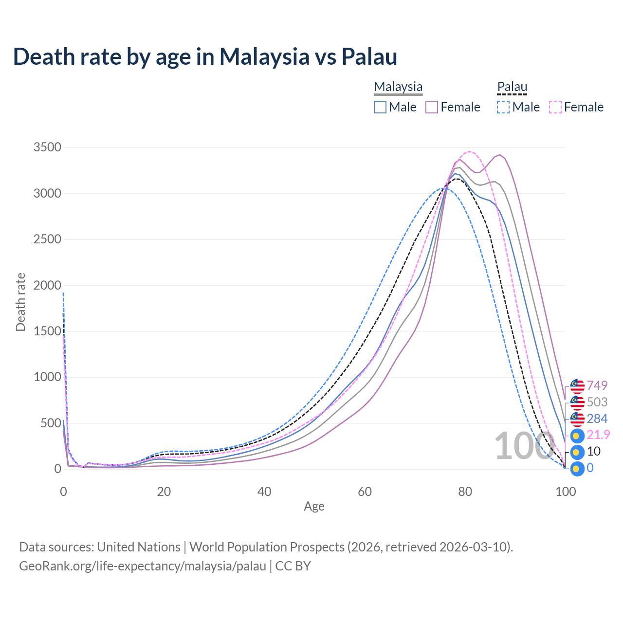 This life expectancy calculator shows the odds of living to 100, 95, 90, and below based on current age for both males and females in Malaysia and Palau, along with mean and median age of death. The calculations are based on the 2026 life tables (actuarial tables) from the UN World Population Prospects.