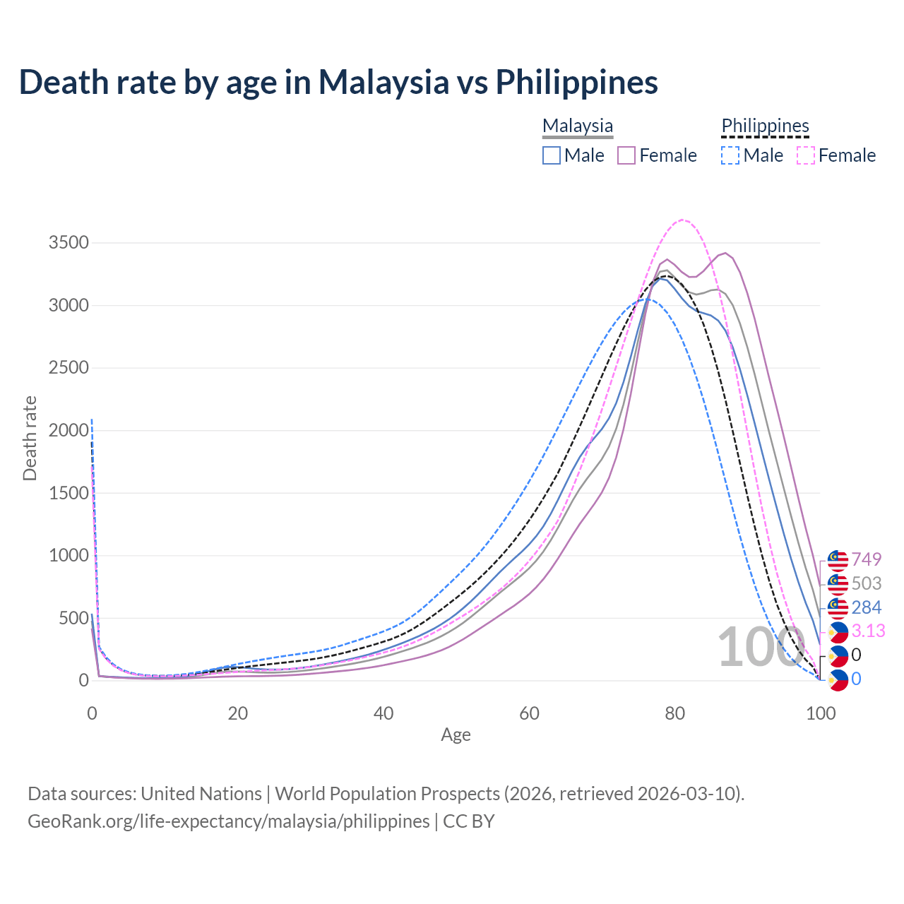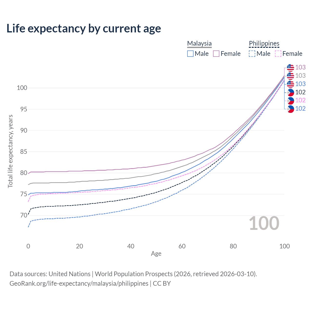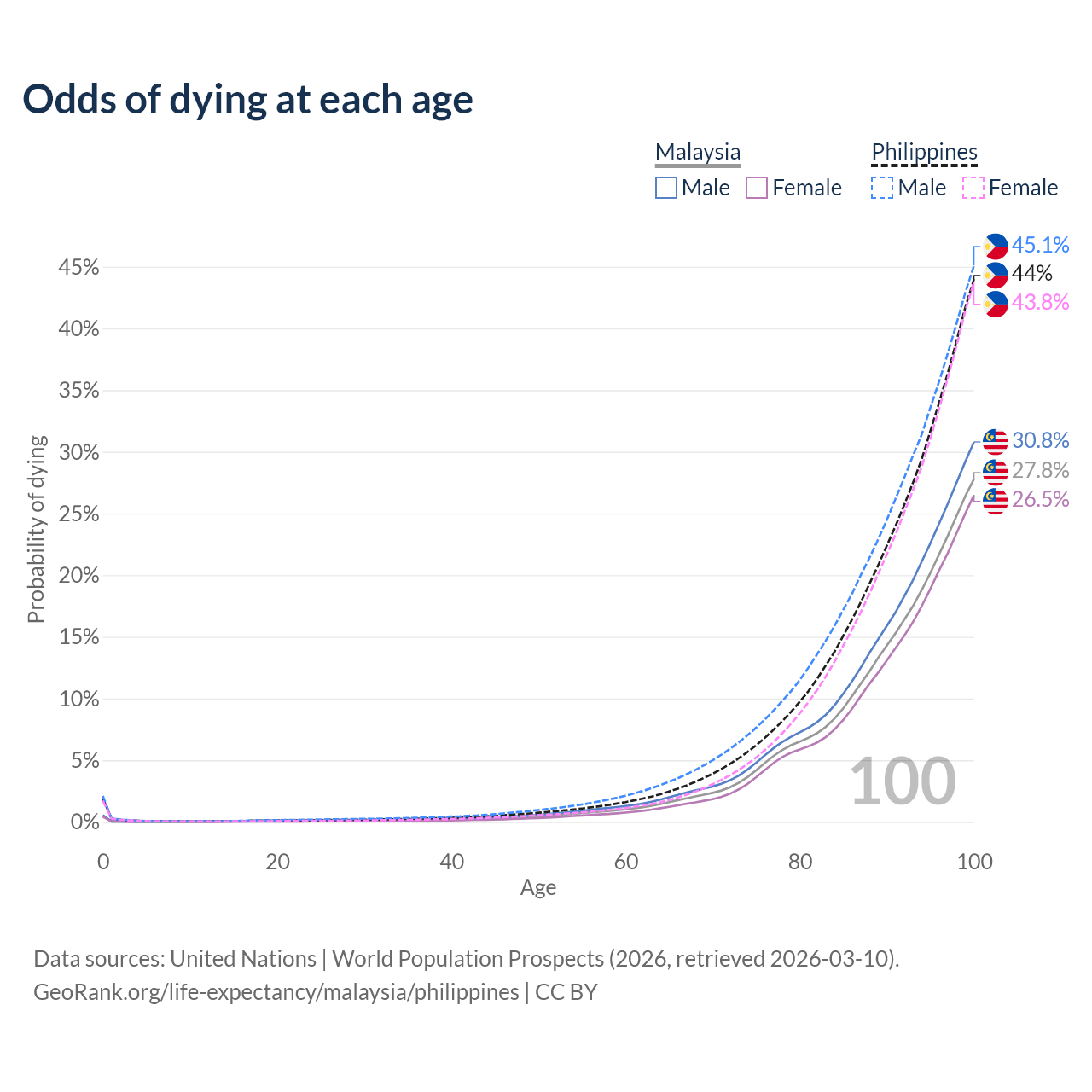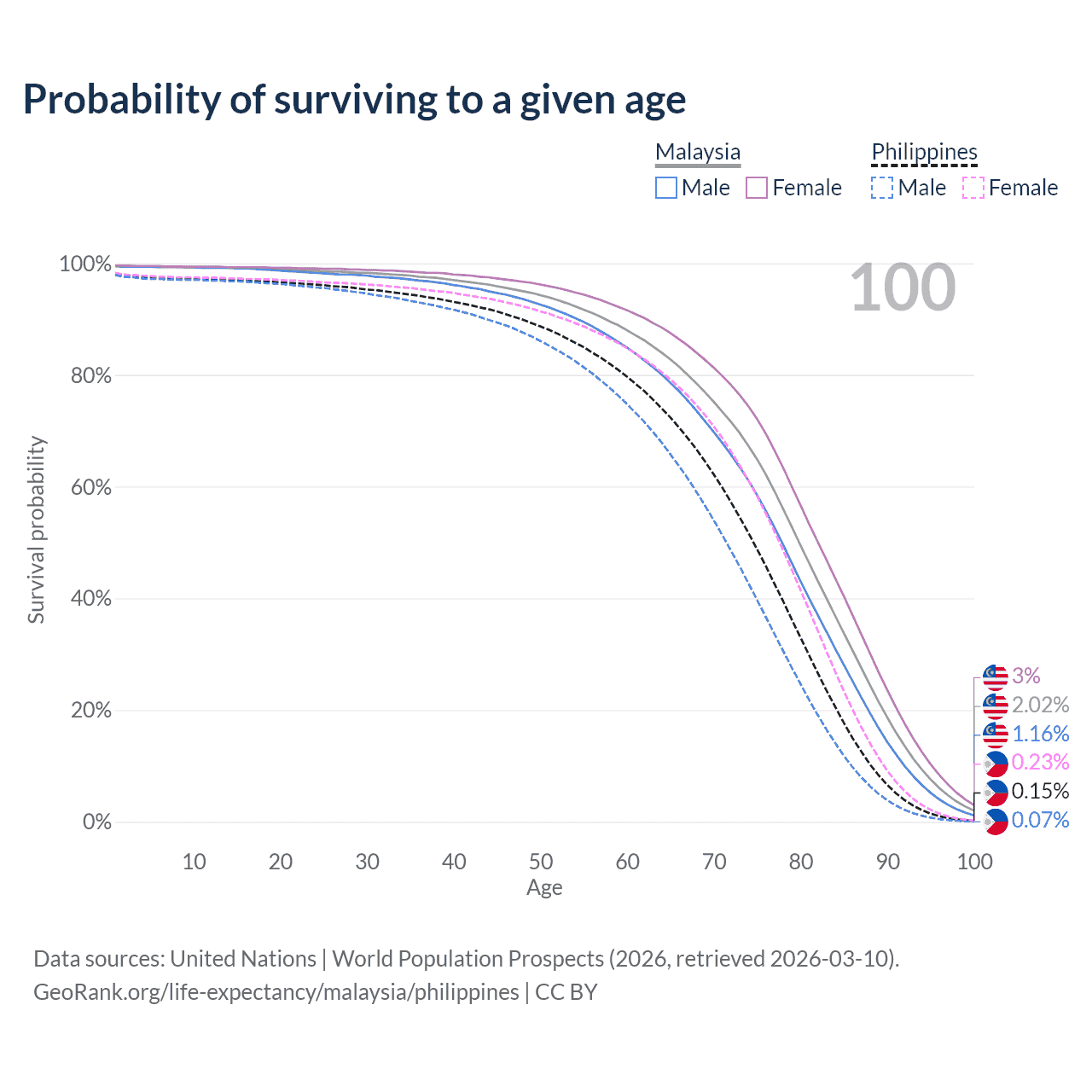 This life expectancy calculator shows the odds of living to 100, 95, 90, and below based on current age for both males and females in Malaysia and the Philippines, along with mean and median age of death. The calculations are based on the 2026 life tables (actuarial tables) from the UN World Population Prospects.