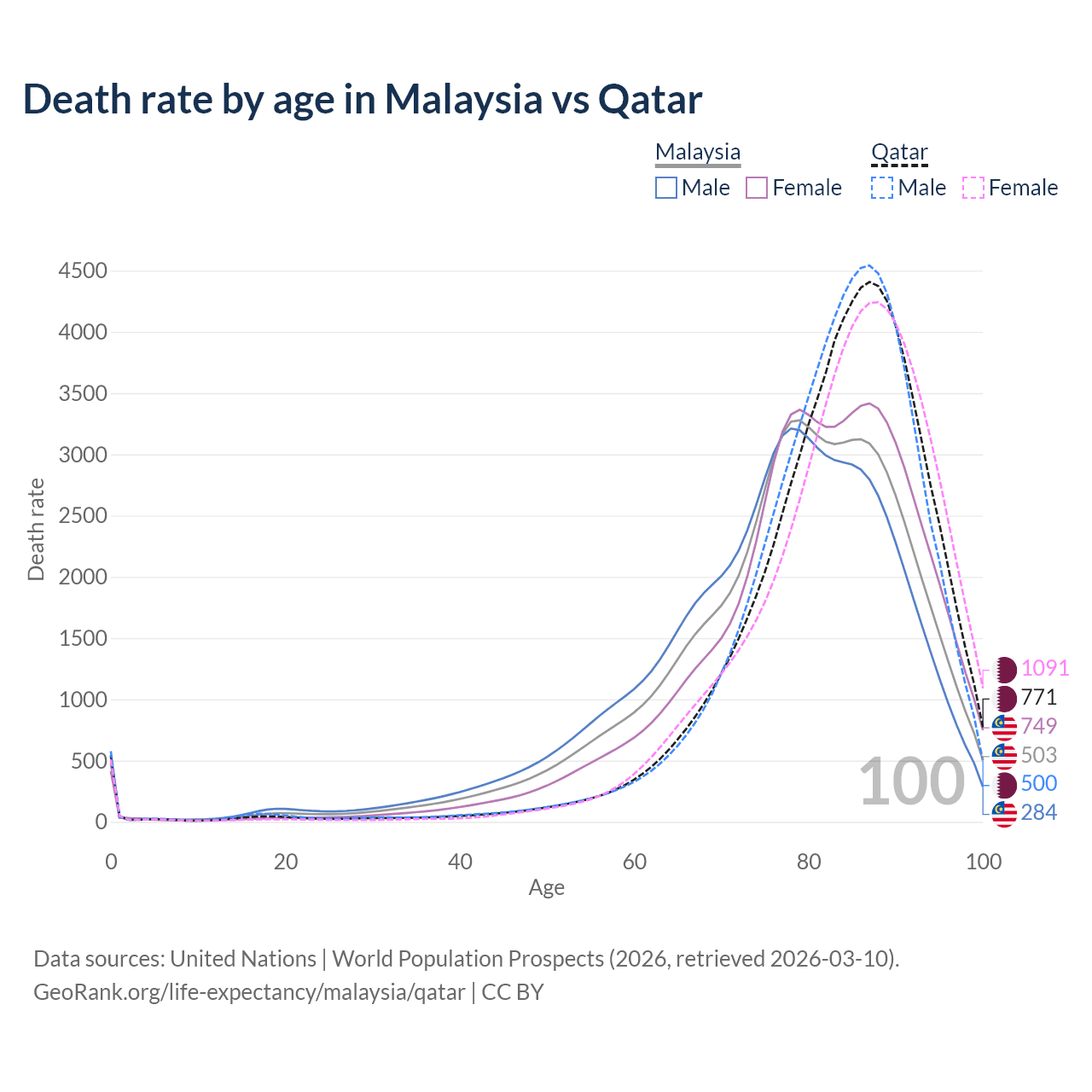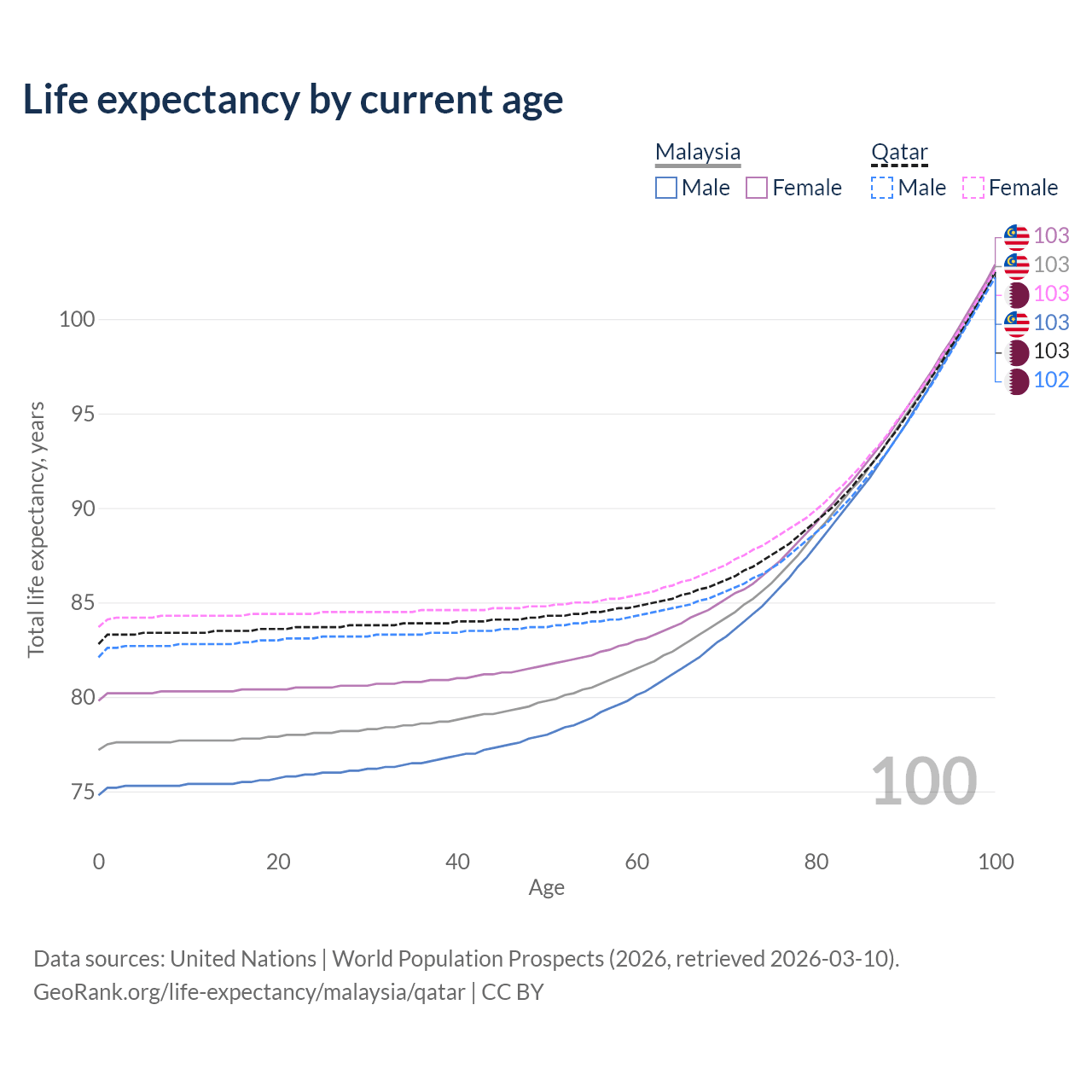 This life expectancy calculator shows the odds of living to 100, 95, 90, and below based on current age for both males and females in Malaysia and Qatar, along with mean and median age of death. The calculations are based on the 2026 life tables (actuarial tables) from the UN World Population Prospects.