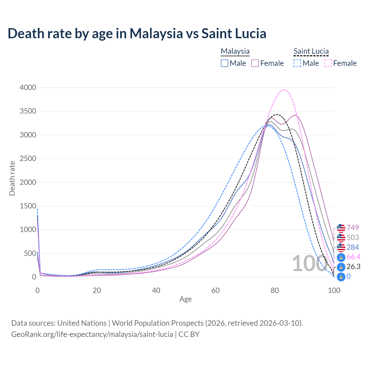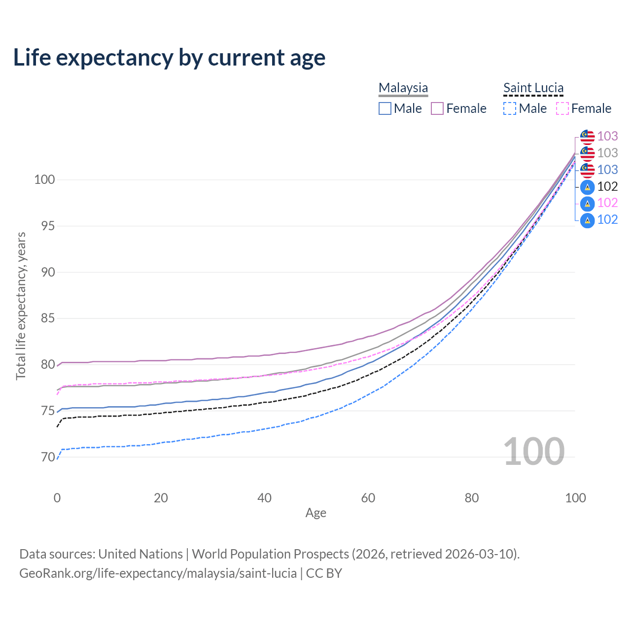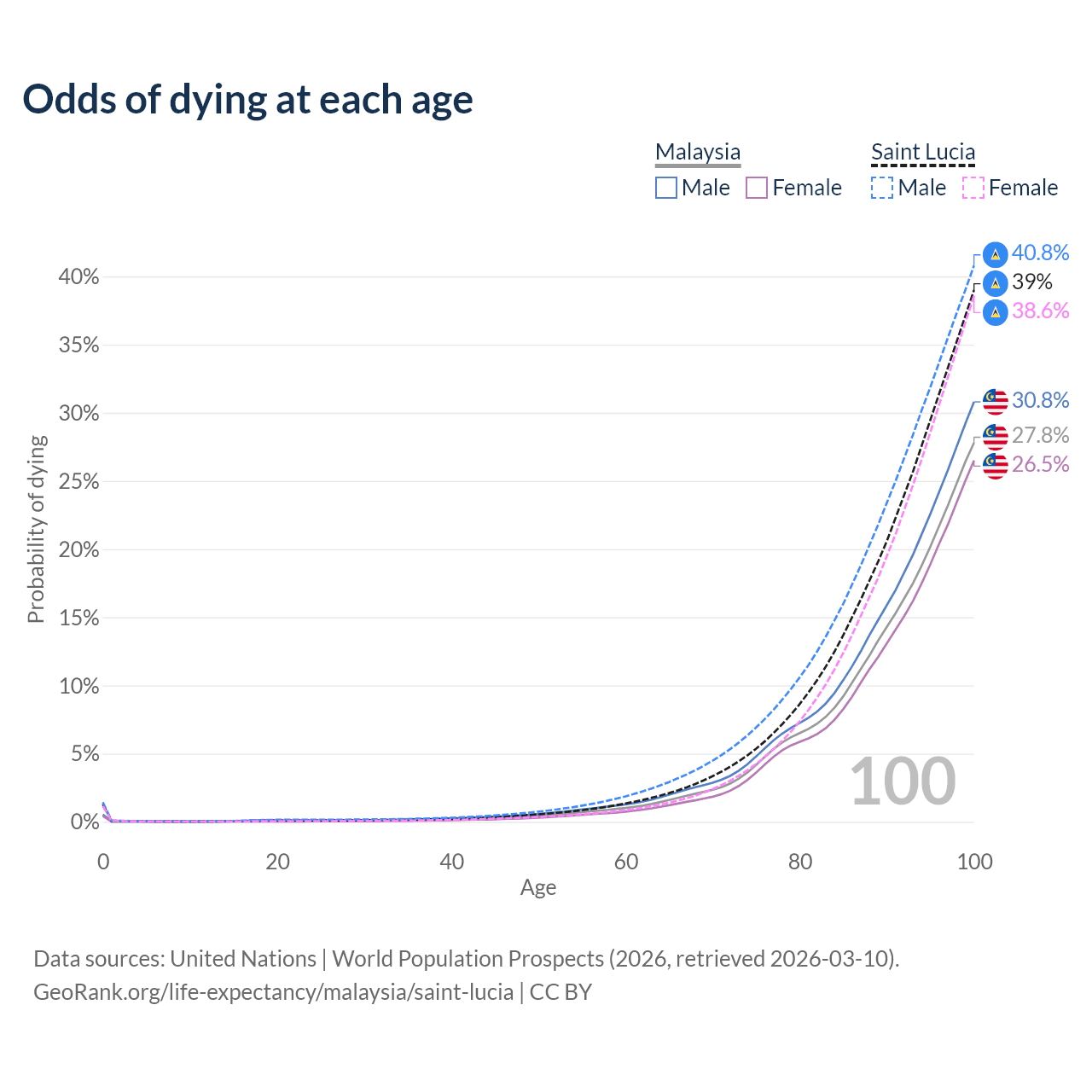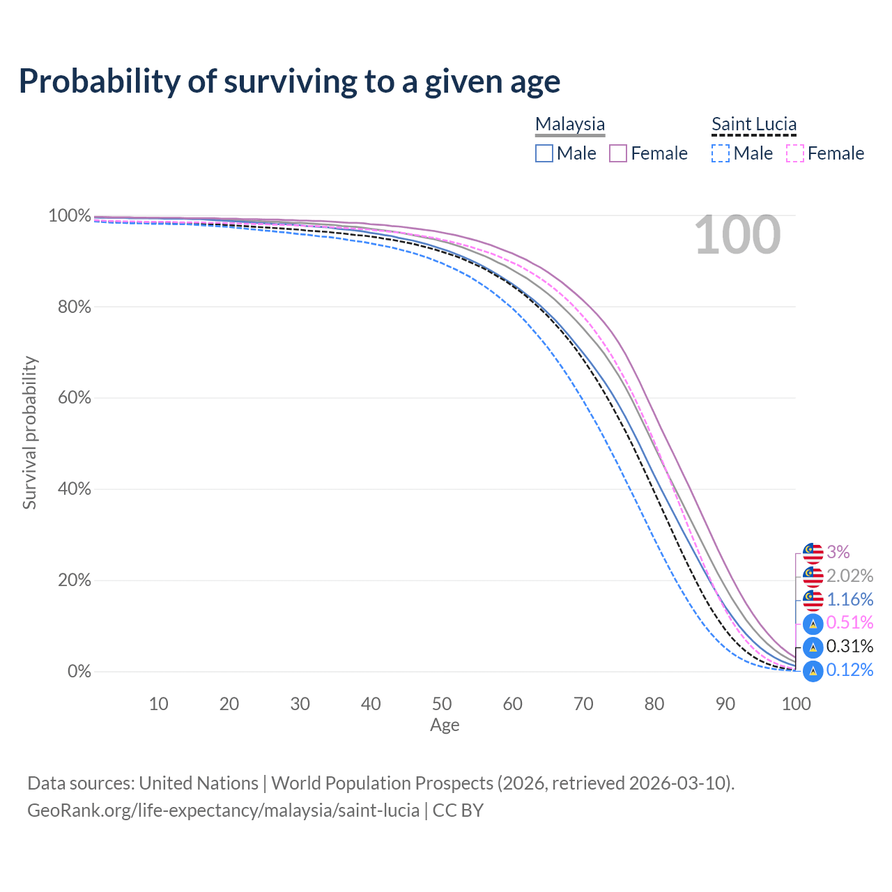 This life expectancy calculator shows the odds of living to 100, 95, 90, and below based on current age for both males and females in Malaysia and Saint Lucia, along with mean and median age of death. The calculations are based on the 2026 life tables (actuarial tables) from the UN World Population Prospects.