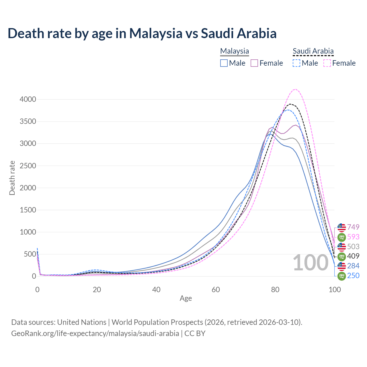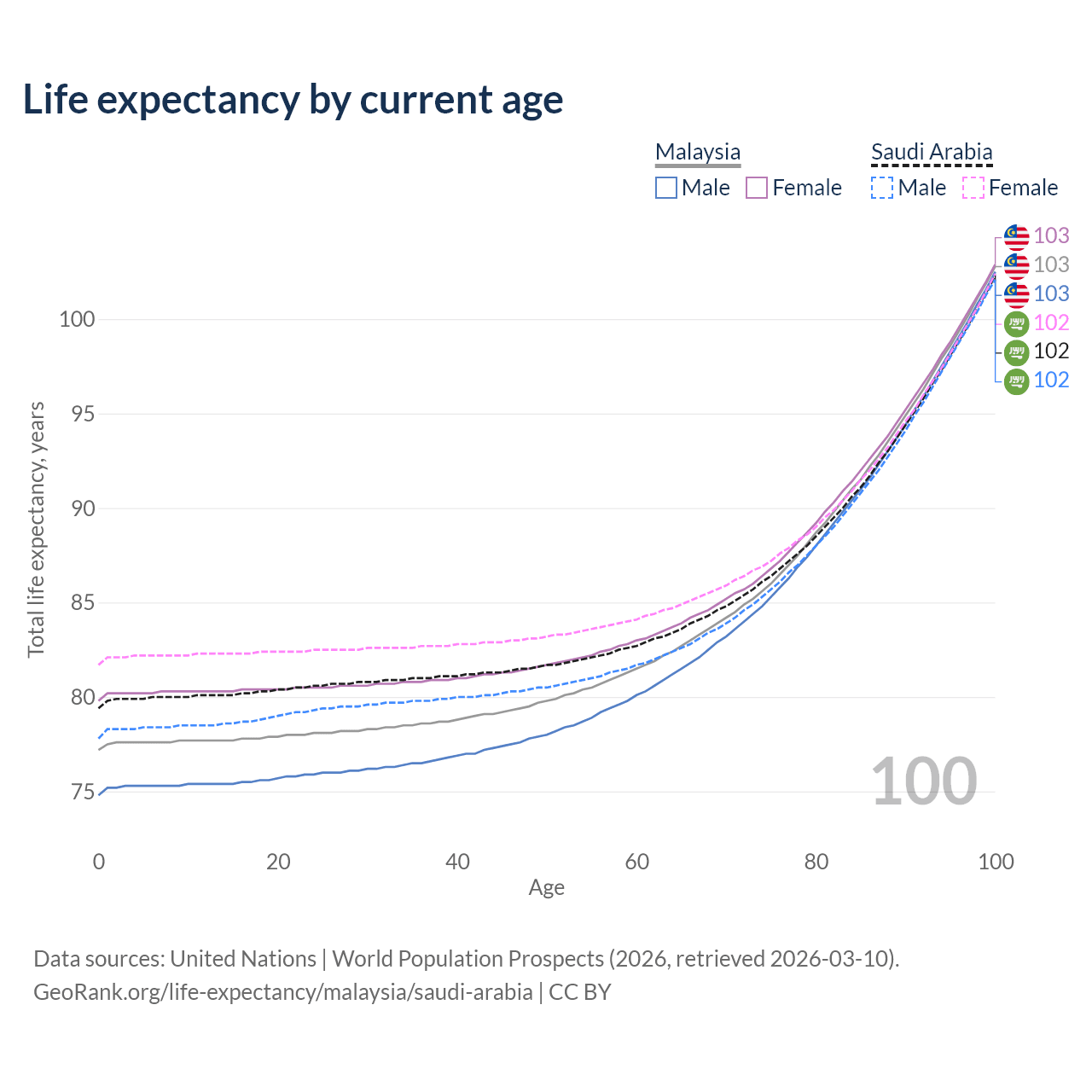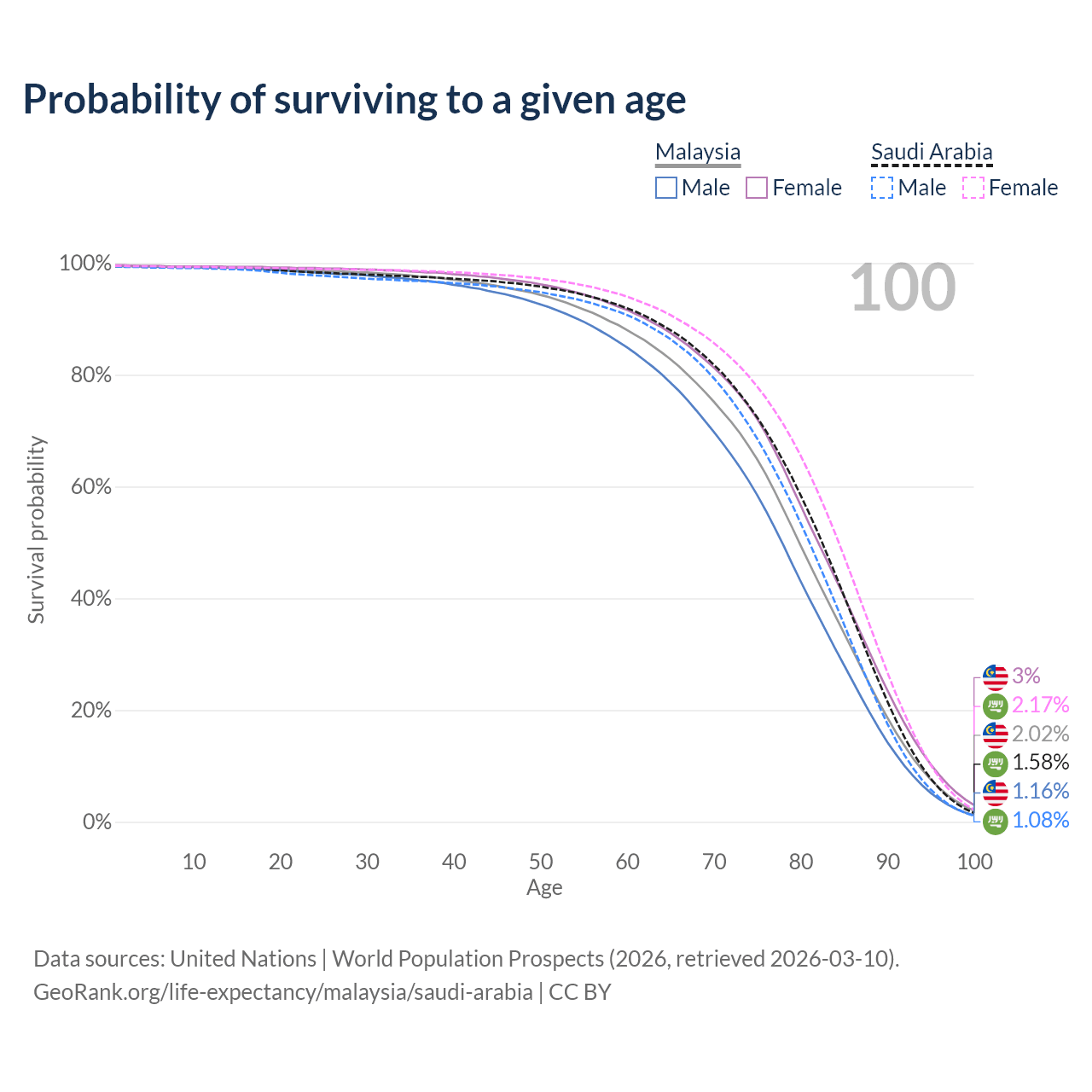 This life expectancy calculator shows the odds of living to 100, 95, 90, and below based on current age for both males and females in Malaysia and Saudi Arabia, along with mean and median age of death. The calculations are based on the 2026 life tables (actuarial tables) from the UN World Population Prospects.