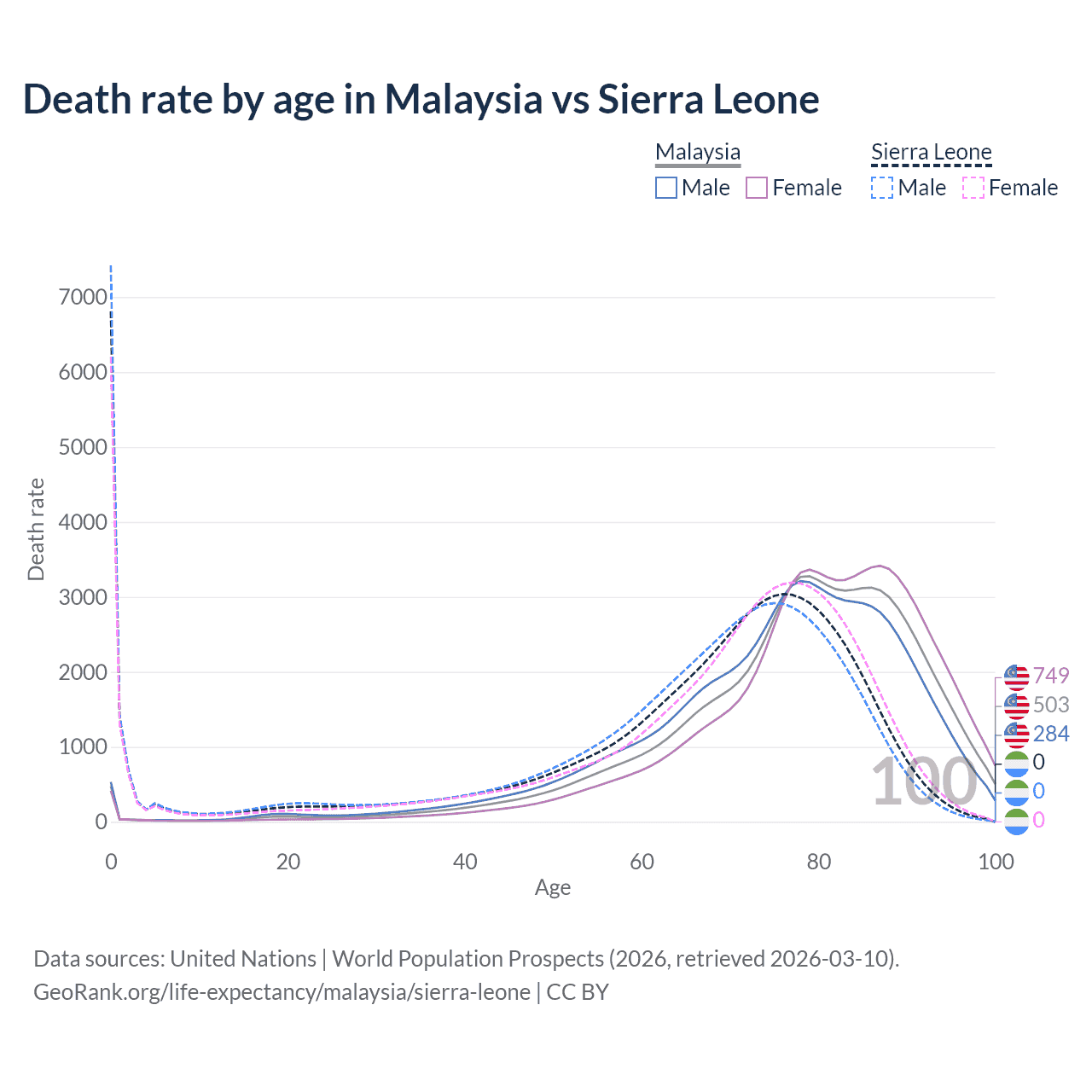 In Malaysia, the most common age of death is 79, compared to 0 in Sierra Leone. The median age of death is 79.8 in Malaysia and 70.8 in Sierra Leone, meaning only half of each cohort is expected to live past that age.