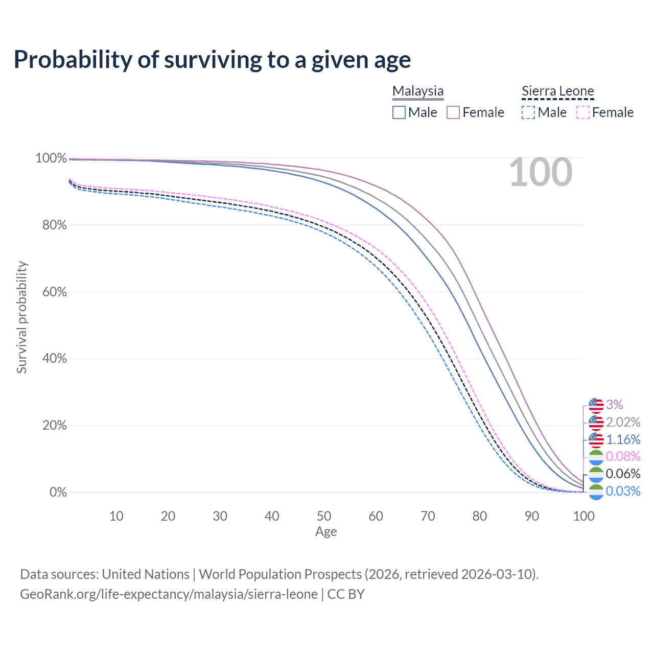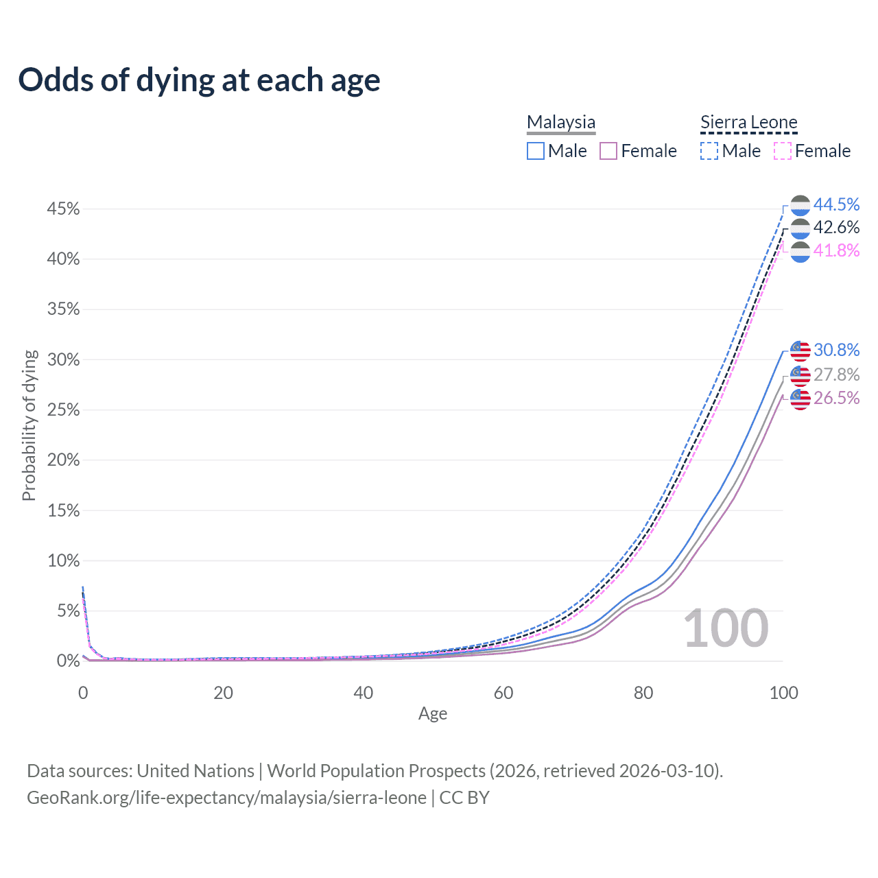 This life expectancy calculator shows the odds of living to 100, 95, 90, and below based on current age for both males and females in Malaysia and Sierra Leone, along with mean and median age of death. The calculations are based on the 2026 life tables (actuarial tables) from the UN World Population Prospects.
