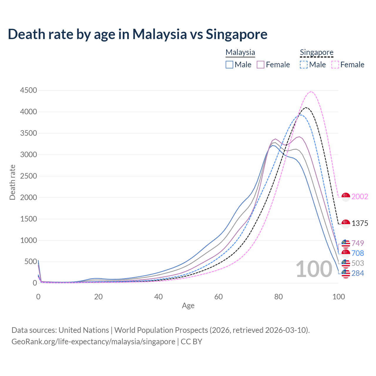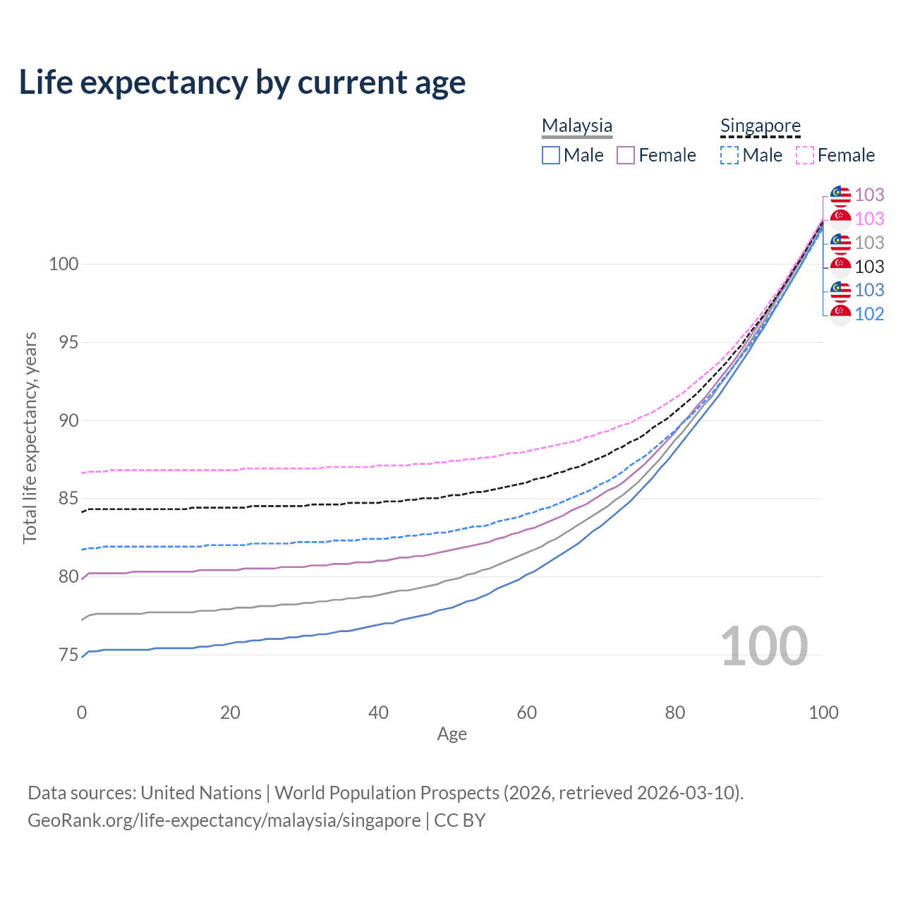 This life expectancy calculator shows the odds of living to 100, 95, 90, and below based on current age for both males and females in Malaysia and Singapore, along with mean and median age of death. The calculations are based on the 2026 life tables (actuarial tables) from the UN World Population Prospects.