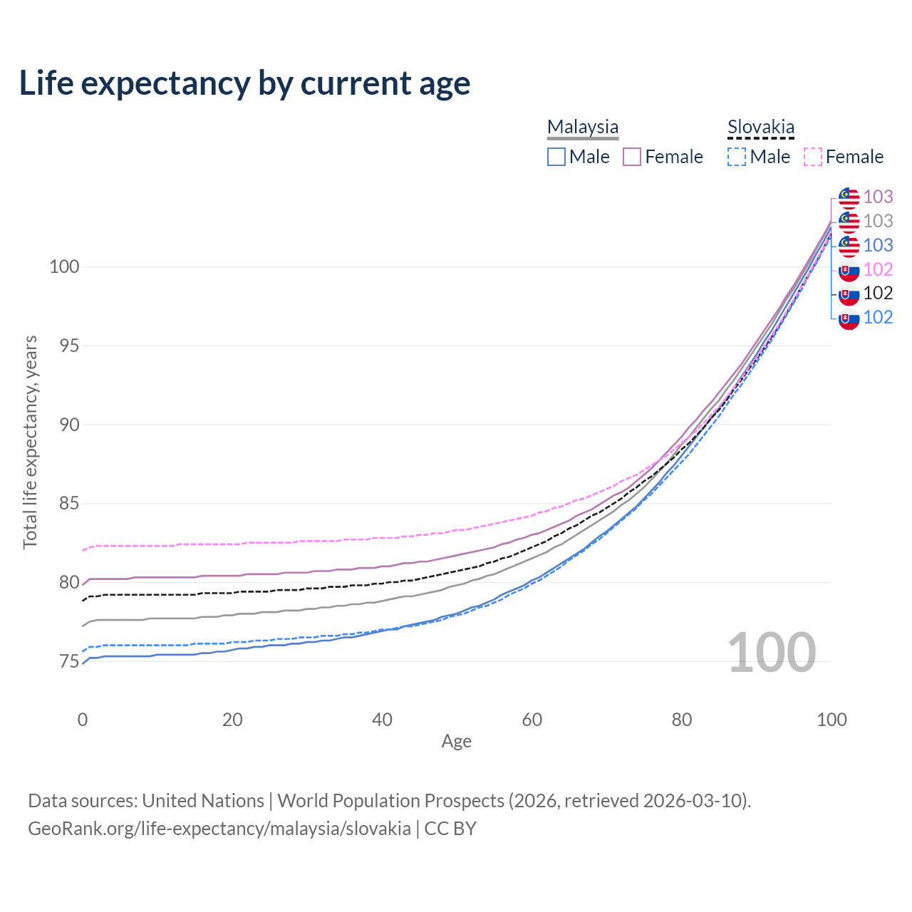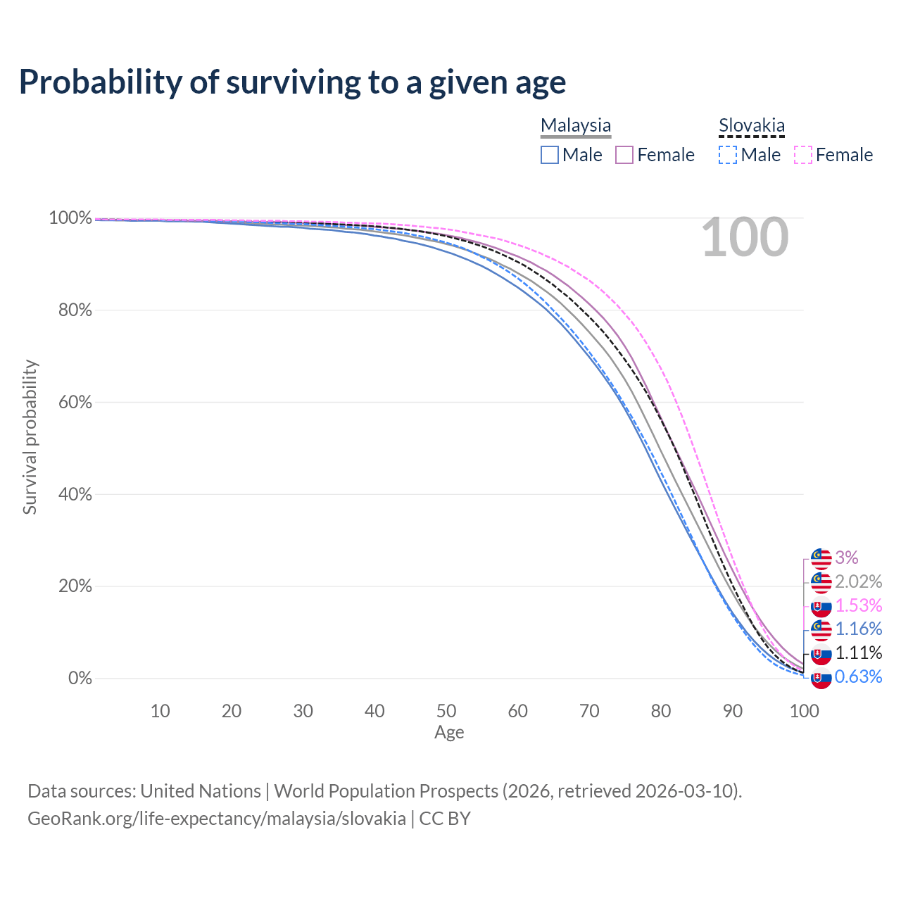 This life expectancy calculator shows the odds of living to 100, 95, 90, and below based on current age for both males and females in Malaysia and Slovakia, along with mean and median age of death. The calculations are based on the 2026 life tables (actuarial tables) from the UN World Population Prospects.