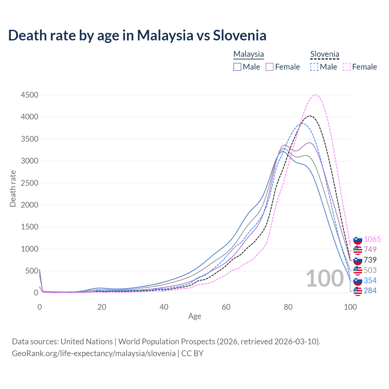 In Malaysia, the most common age of death is 79, compared to 87 in Slovenia. The median age of death is 79.8 in Malaysia and 84.4 in Slovenia, meaning only half of each cohort is expected to live past that age.