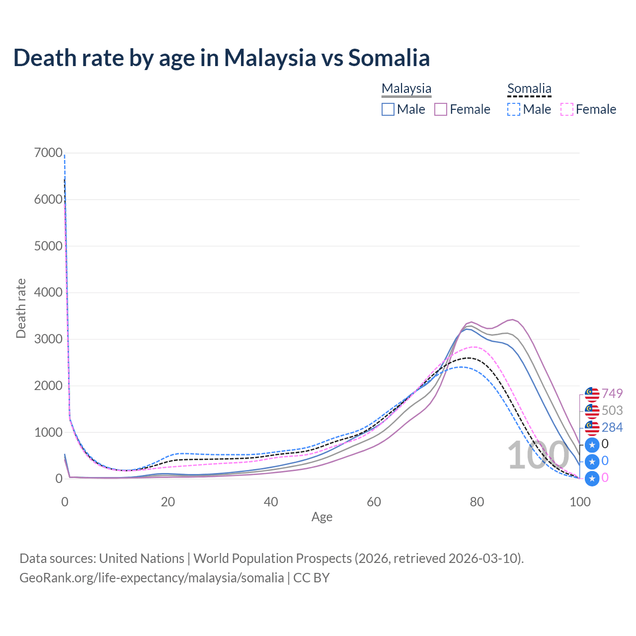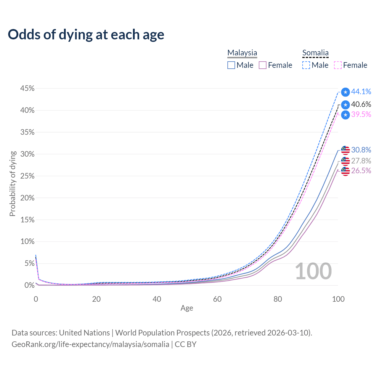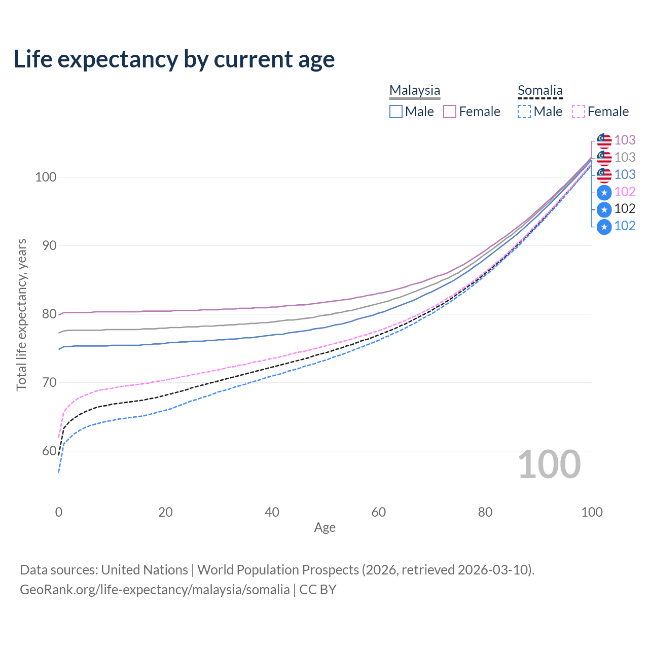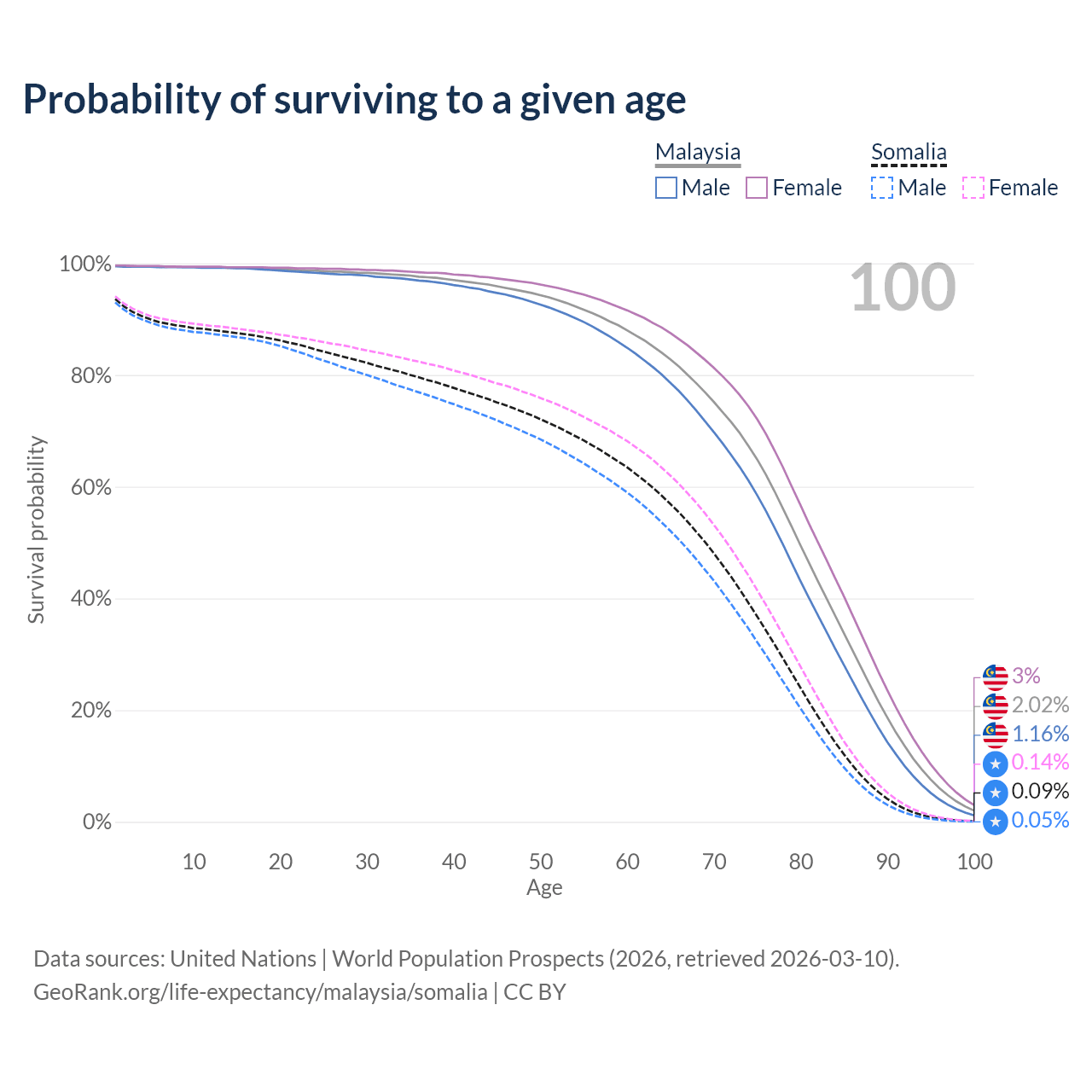 This life expectancy calculator shows the odds of living to 100, 95, 90, and below based on current age for both males and females in Malaysia and Somalia, along with mean and median age of death. The calculations are based on the 2026 life tables (actuarial tables) from the UN World Population Prospects.