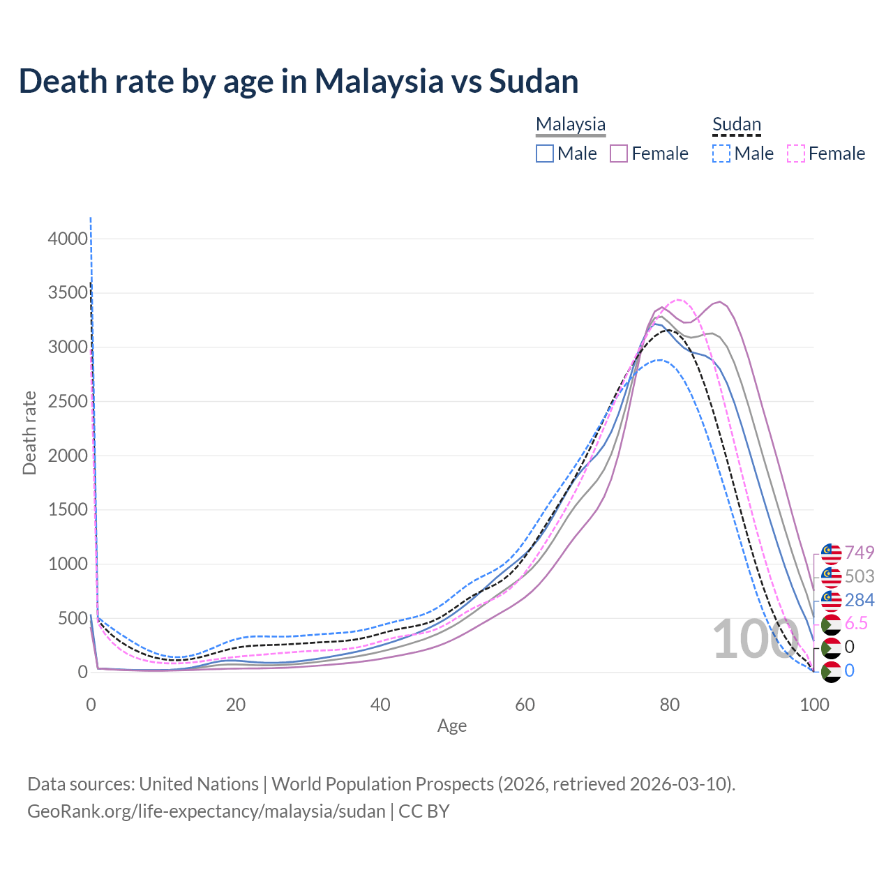 In Malaysia, the most common age of death is 79, compared to 0 in Sudan. The median age of death is 79.8 in Malaysia and 74.1 in Sudan, meaning only half of each cohort is expected to live past that age.