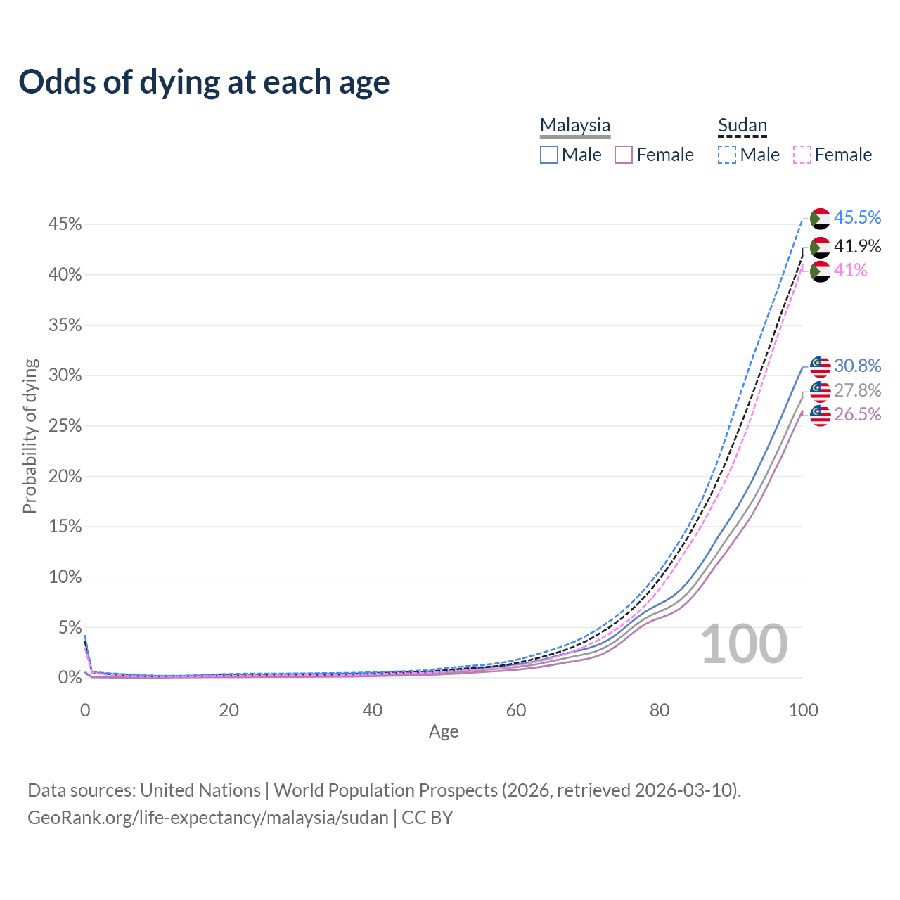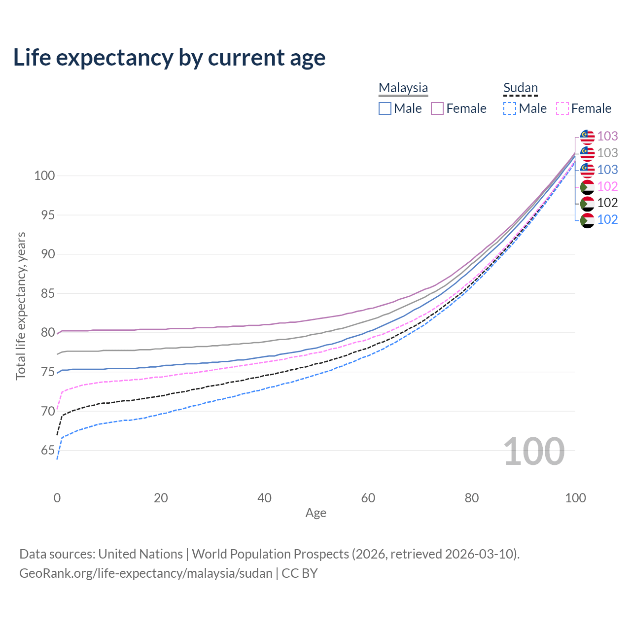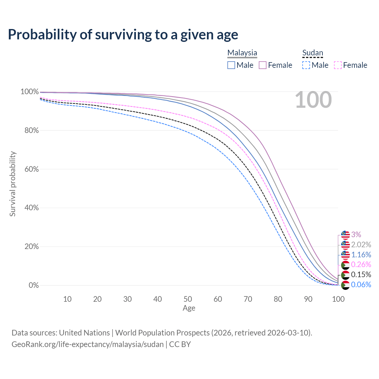This life expectancy calculator shows the odds of living to 100, 95, 90, and below based on current age for both males and females in Malaysia and Sudan, along with mean and median age of death. The calculations are based on the 2026 life tables (actuarial tables) from the UN World Population Prospects.