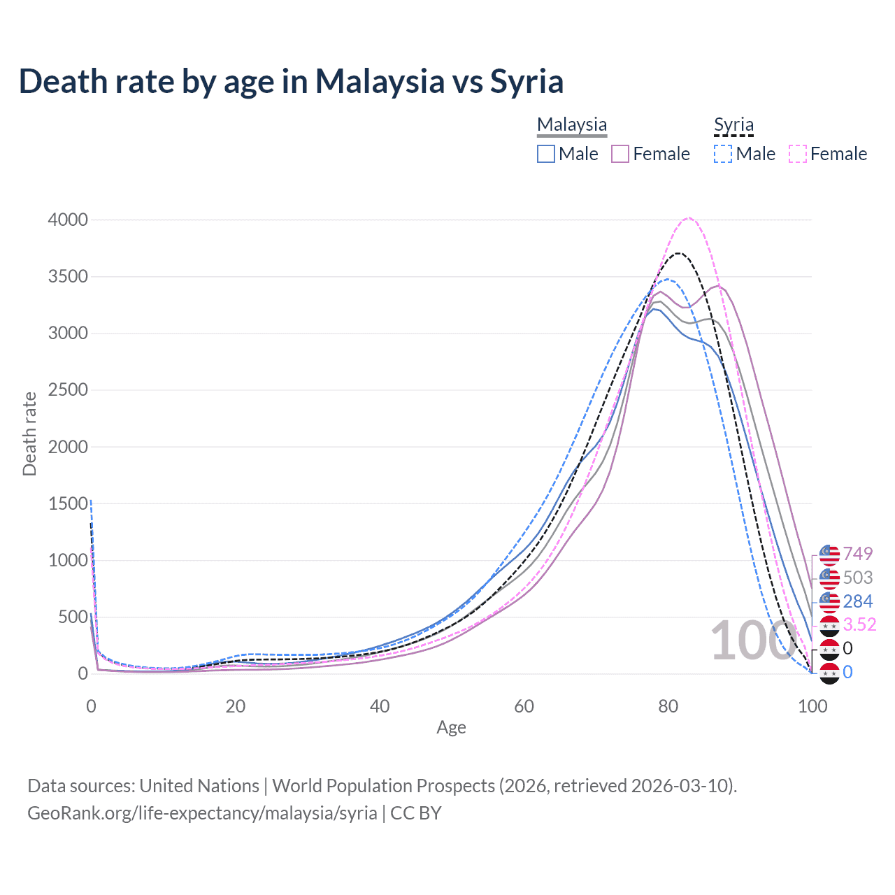 In Malaysia, the most common age of death is 79, compared to 82 in Syria. The median age of death is 79.8 in Malaysia and 77.7 in Syria, meaning only half of each cohort is expected to live past that age.