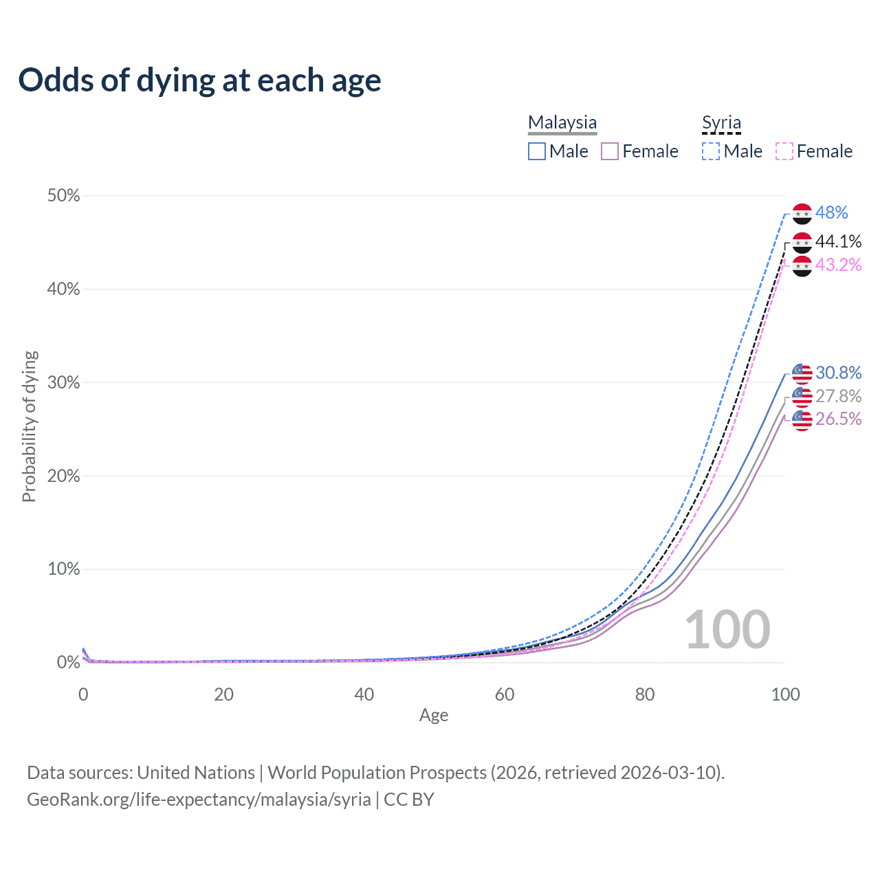 This life expectancy calculator shows the odds of living to 100, 95, 90, and below based on current age for both males and females in Malaysia and Syria, along with mean and median age of death. The calculations are based on the 2026 life tables (actuarial tables) from the UN World Population Prospects.