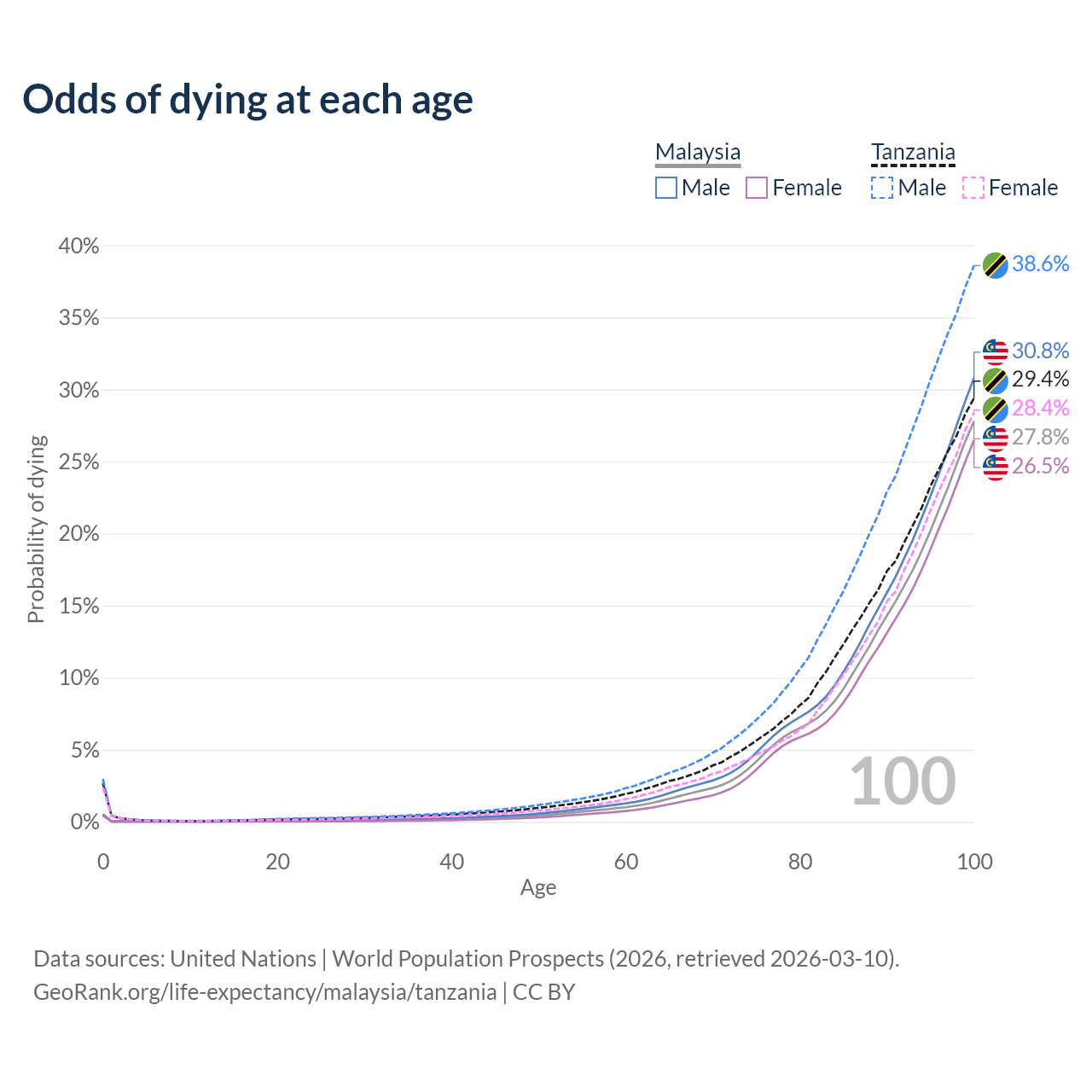 This life expectancy calculator shows the odds of living to 100, 95, 90, and below based on current age for both males and females in Malaysia and Tanzania, along with mean and median age of death. The calculations are based on the 2026 life tables (actuarial tables) from the UN World Population Prospects.