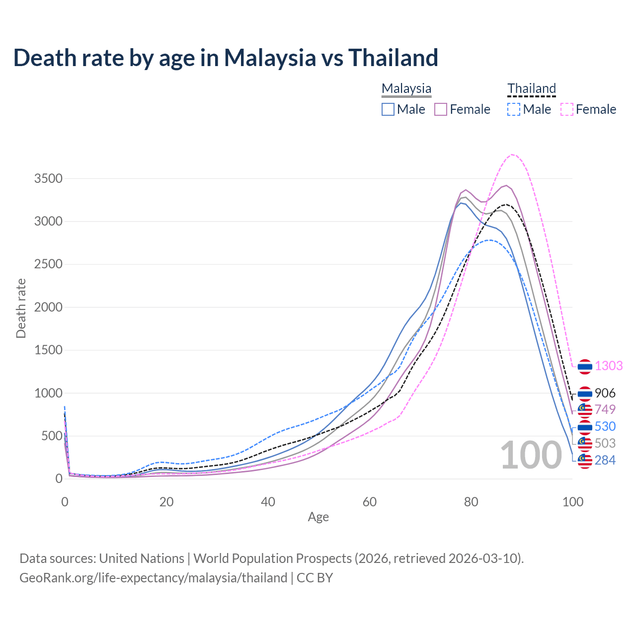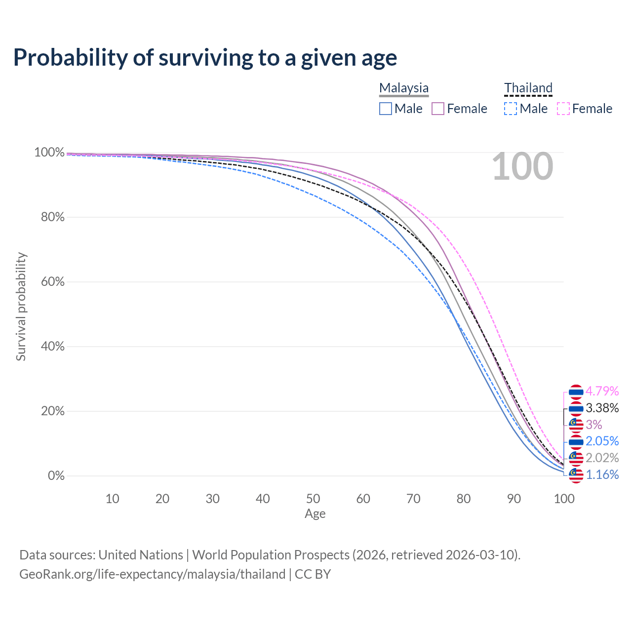 This life expectancy calculator shows the odds of living to 100, 95, 90, and below based on current age for both males and females in Malaysia and Thailand, along with mean and median age of death. The calculations are based on the 2026 life tables (actuarial tables) from the UN World Population Prospects.