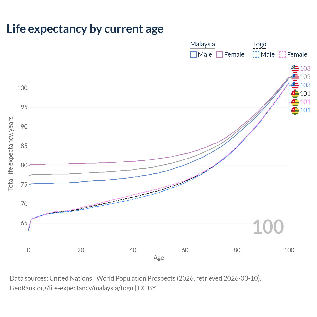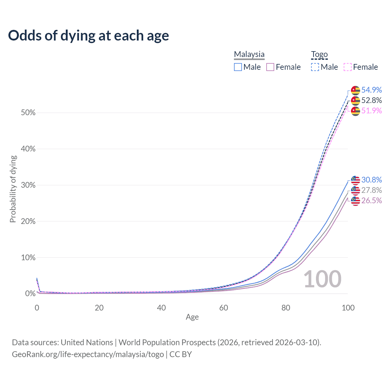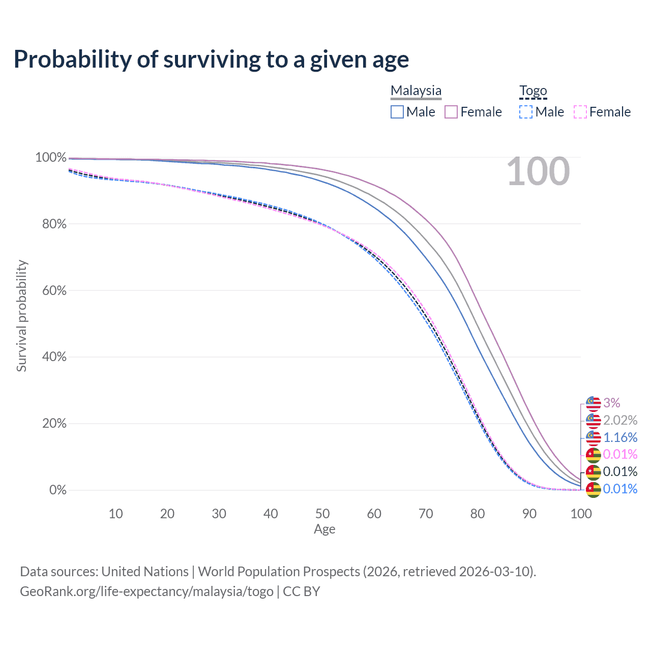 This life expectancy calculator shows the odds of living to 100, 95, 90, and below based on current age for both males and females in Malaysia and Togo, along with mean and median age of death. The calculations are based on the 2026 life tables (actuarial tables) from the UN World Population Prospects.