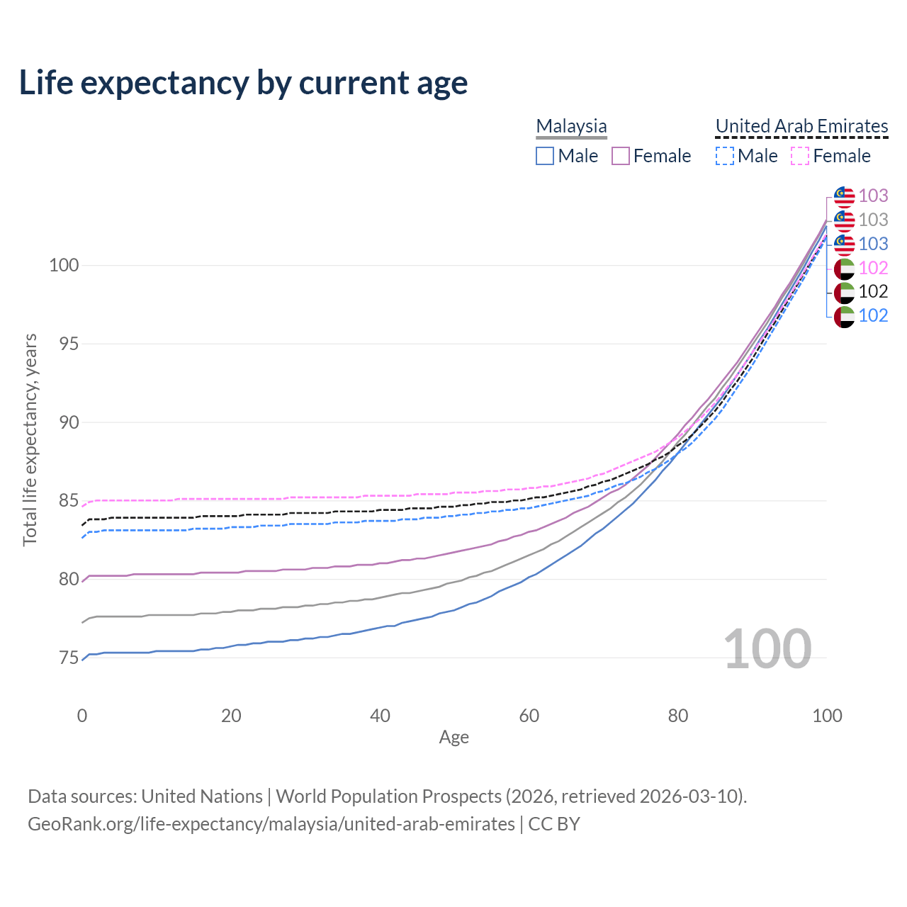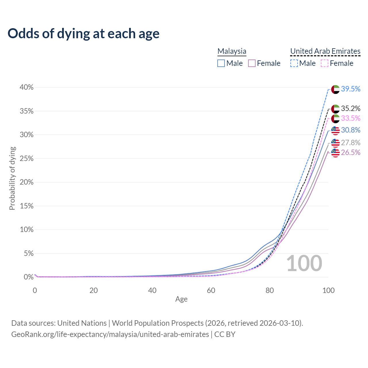 This life expectancy calculator shows the odds of living to 100, 95, 90, and below based on current age for both males and females in Malaysia and the United Arab Emirates, along with mean and median age of death. The calculations are based on the 2026 life tables (actuarial tables) from the UN World Population Prospects.