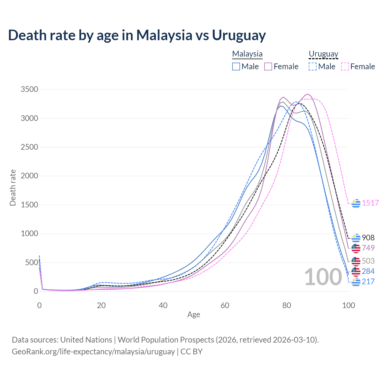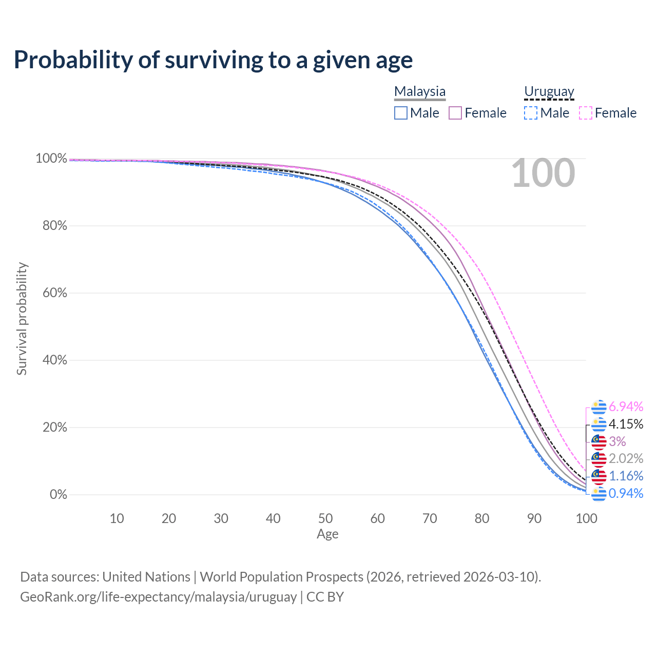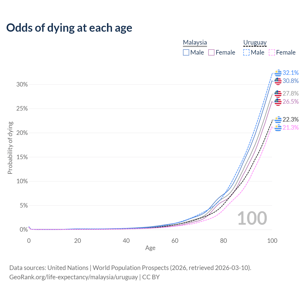 This life expectancy calculator shows the odds of living to 100, 95, 90, and below based on current age for both males and females in Malaysia and Uruguay, along with mean and median age of death. The calculations are based on the 2026 life tables (actuarial tables) from the UN World Population Prospects.
