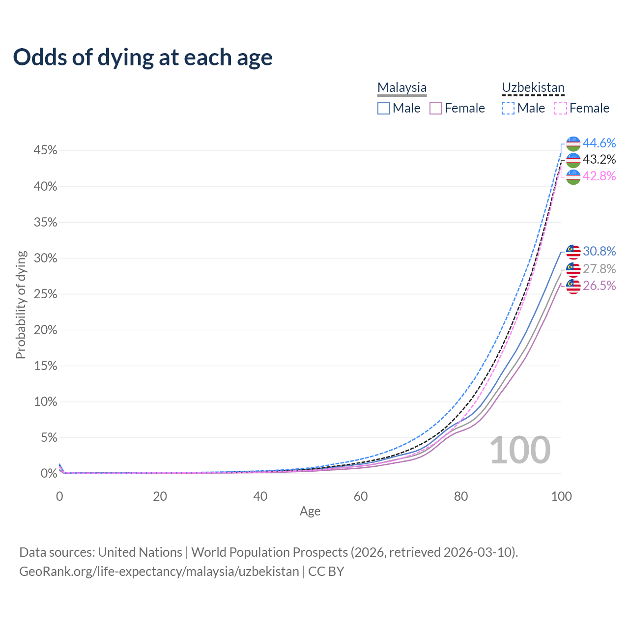 This life expectancy calculator shows the odds of living to 100, 95, 90, and below based on current age for both males and females in Malaysia and Uzbekistan, along with mean and median age of death. The calculations are based on the 2026 life tables (actuarial tables) from the UN World Population Prospects.