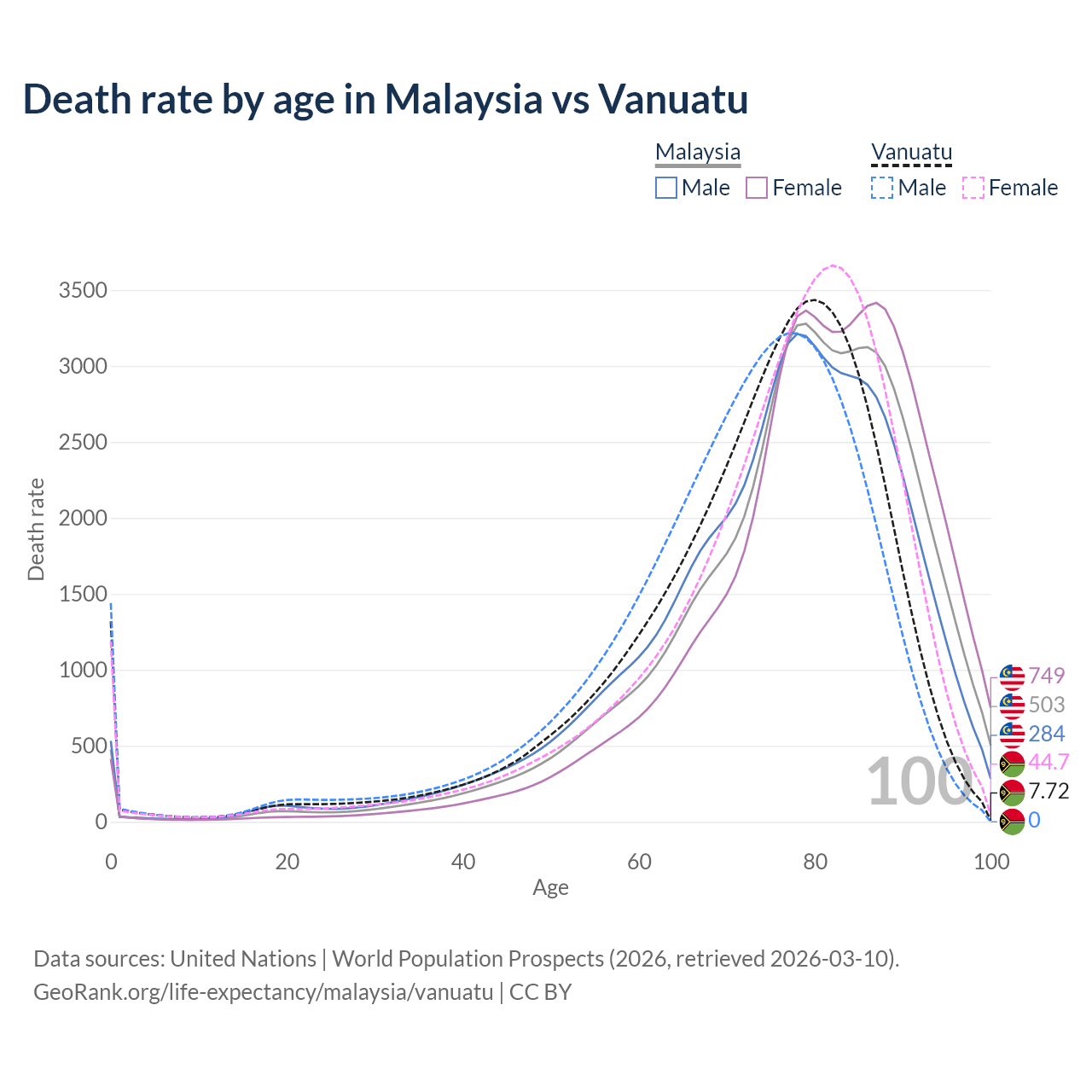 In Malaysia, the most common age of death is 79, compared to 80 in Vanuatu. The median age of death is 79.8 in Malaysia and 75.9 in Vanuatu, meaning only half of each cohort is expected to live past that age.
