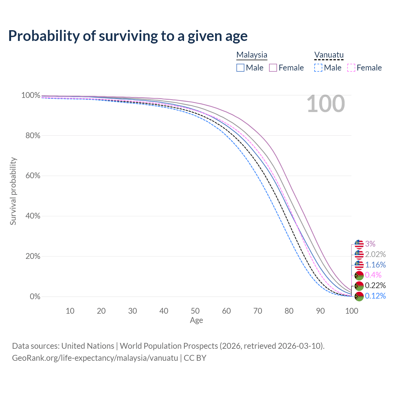 This life expectancy calculator shows the odds of living to 100, 95, 90, and below based on current age for both males and females in Malaysia and Vanuatu, along with mean and median age of death. The calculations are based on the 2026 life tables (actuarial tables) from the UN World Population Prospects.