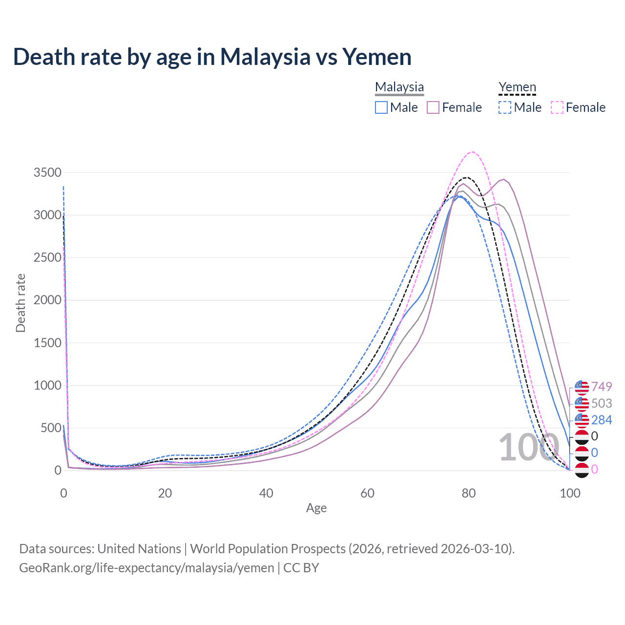In Malaysia, the most common age of death is 79, compared to 80 in Yemen. The median age of death is 79.8 in Malaysia and 74.9 in Yemen, meaning only half of each cohort is expected to live past that age.