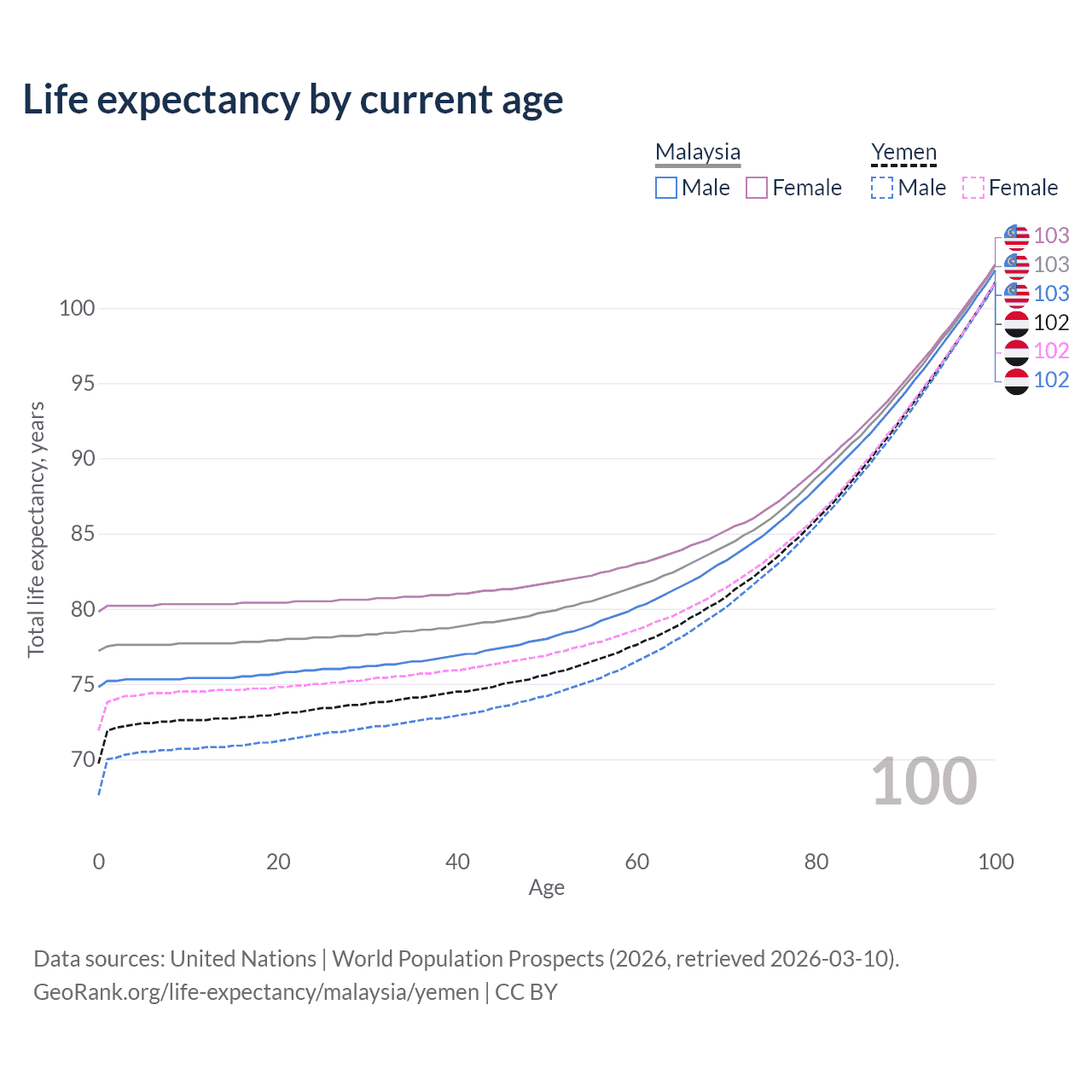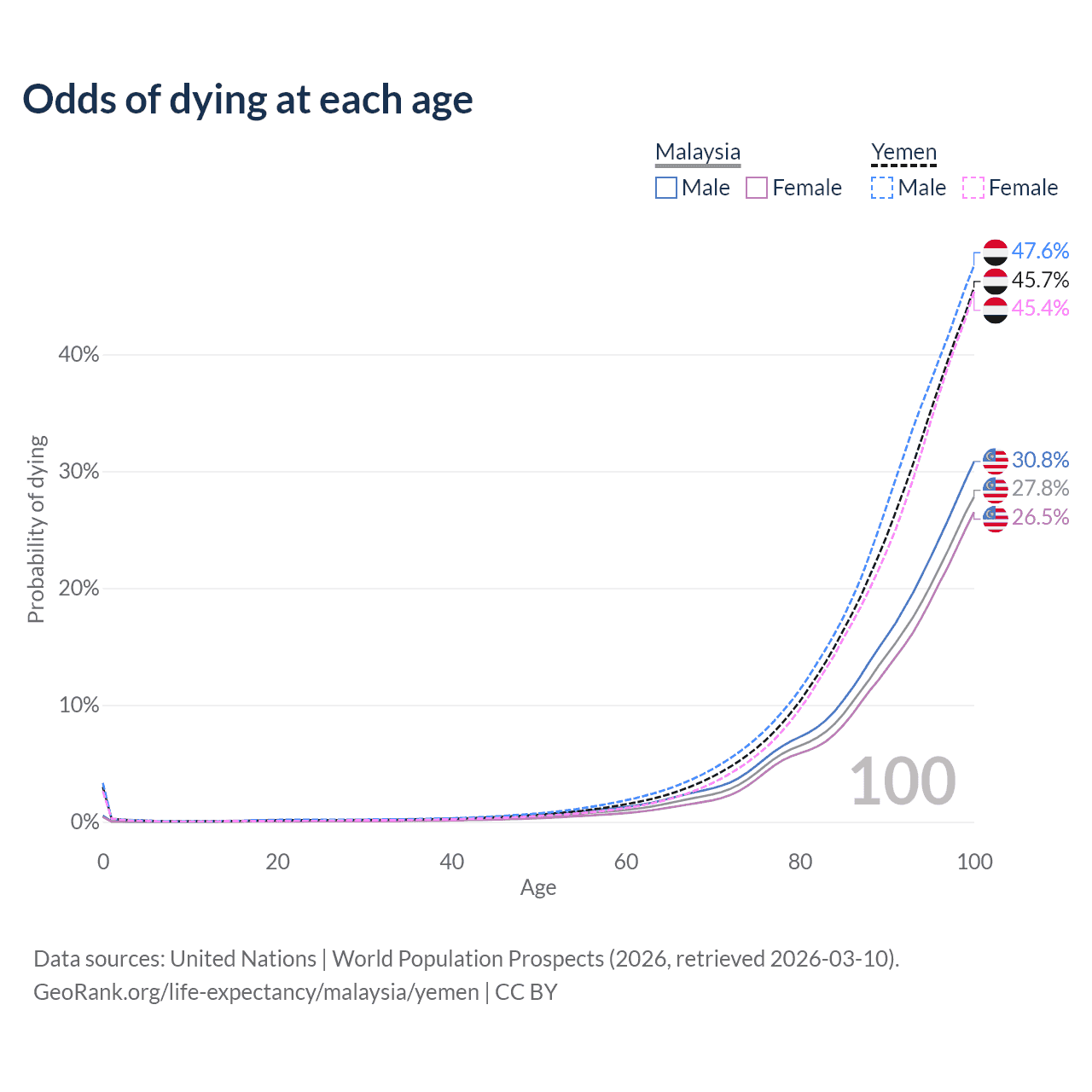 This life expectancy calculator shows the odds of living to 100, 95, 90, and below based on current age for both males and females in Malaysia and Yemen, along with mean and median age of death. The calculations are based on the 2026 life tables (actuarial tables) from the UN World Population Prospects.