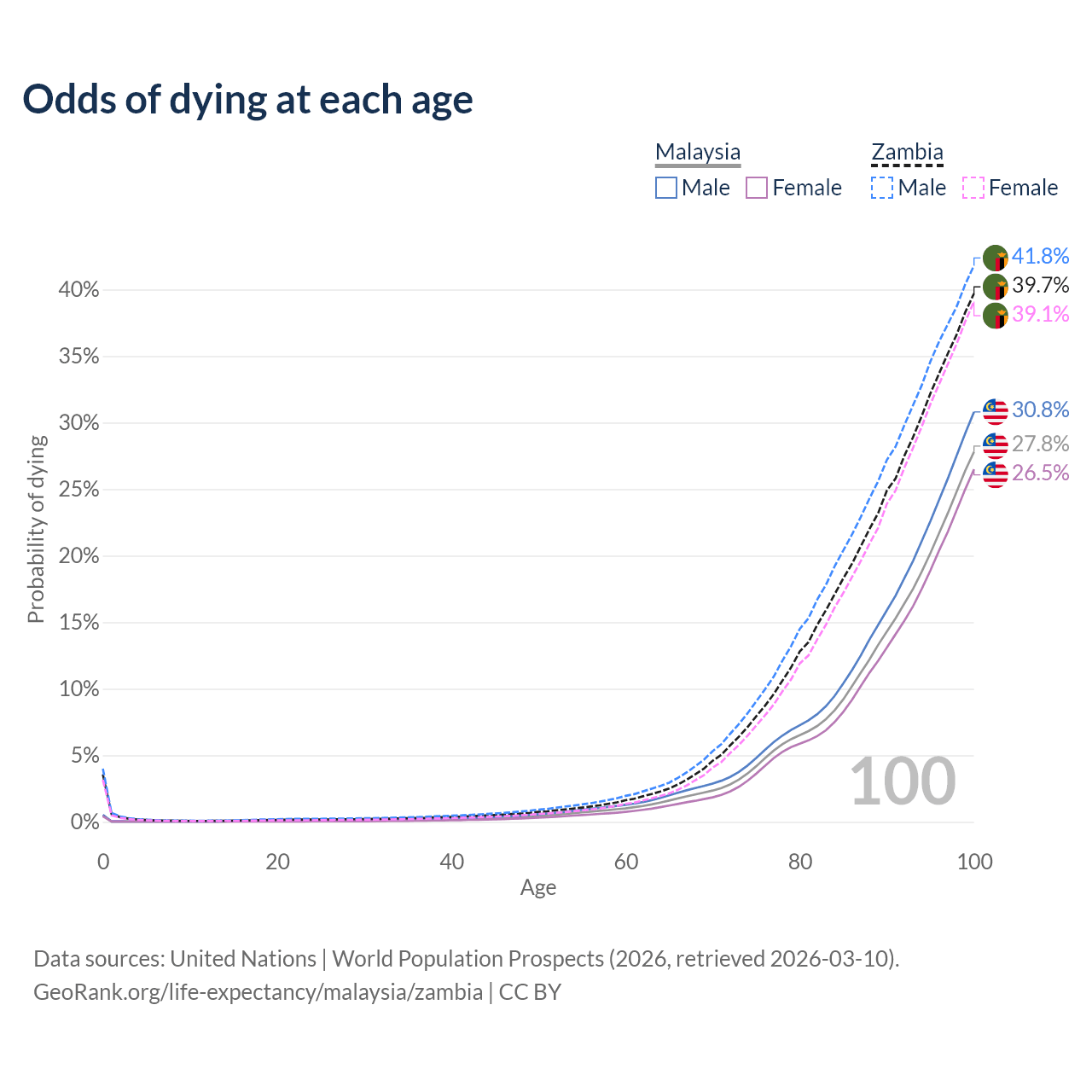 This life expectancy calculator shows the odds of living to 100, 95, 90, and below based on current age for both males and females in Malaysia and Zambia, along with mean and median age of death. The calculations are based on the 2026 life tables (actuarial tables) from the UN World Population Prospects.