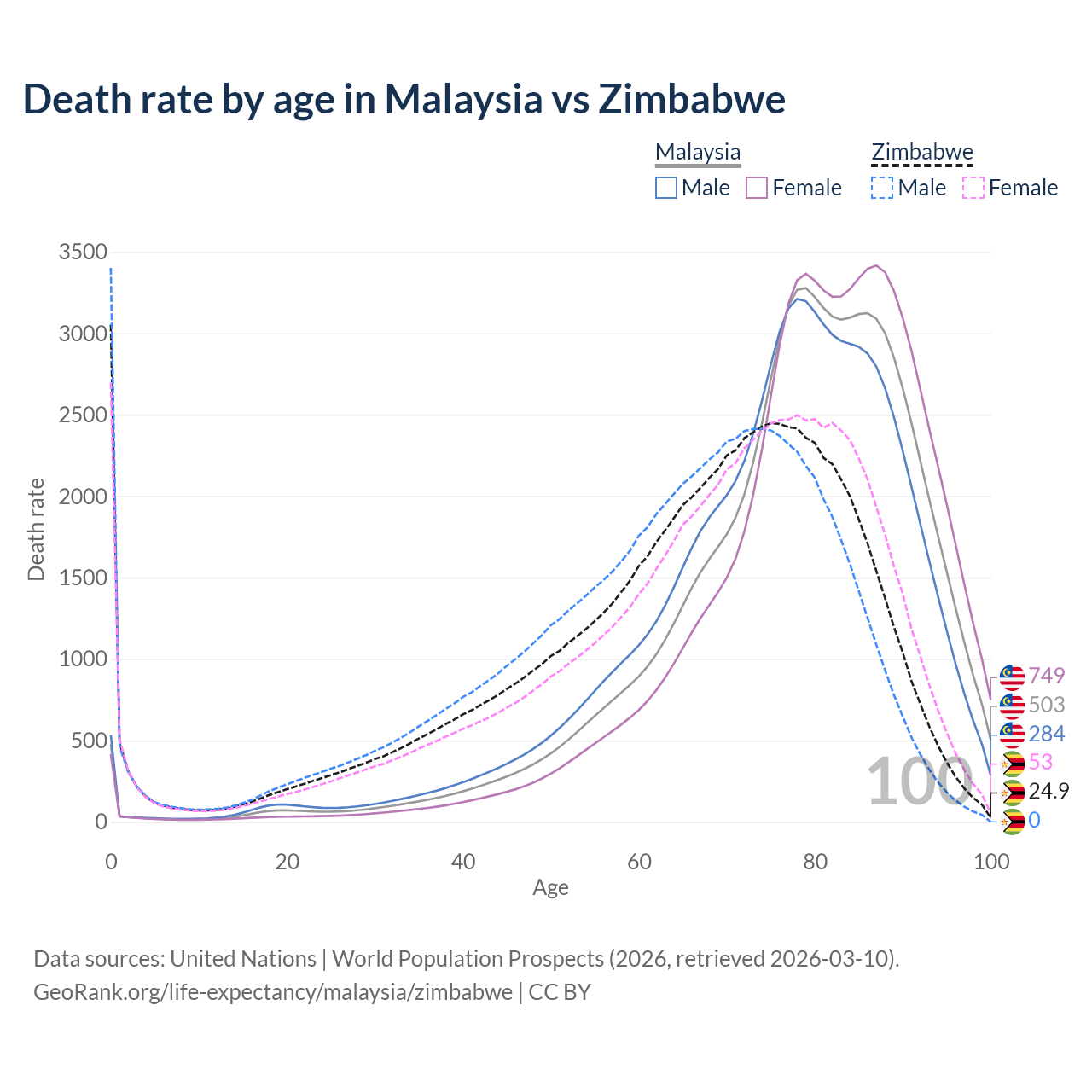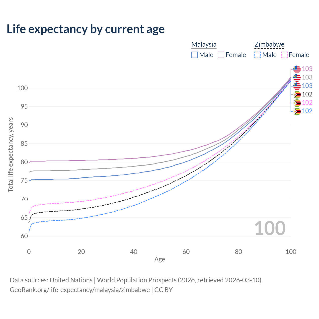 This life expectancy calculator shows the odds of living to 100, 95, 90, and below based on current age for both males and females in Malaysia and Zimbabwe, along with mean and median age of death. The calculations are based on the 2026 life tables (actuarial tables) from the UN World Population Prospects.
