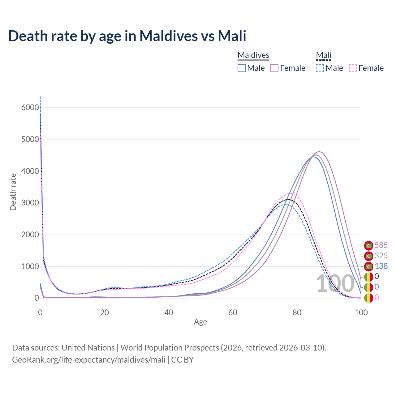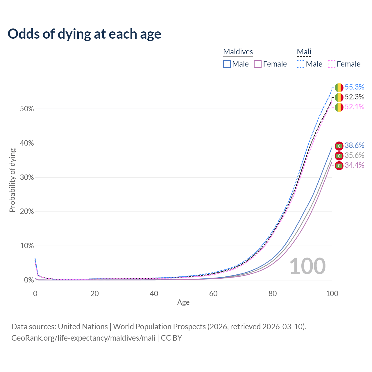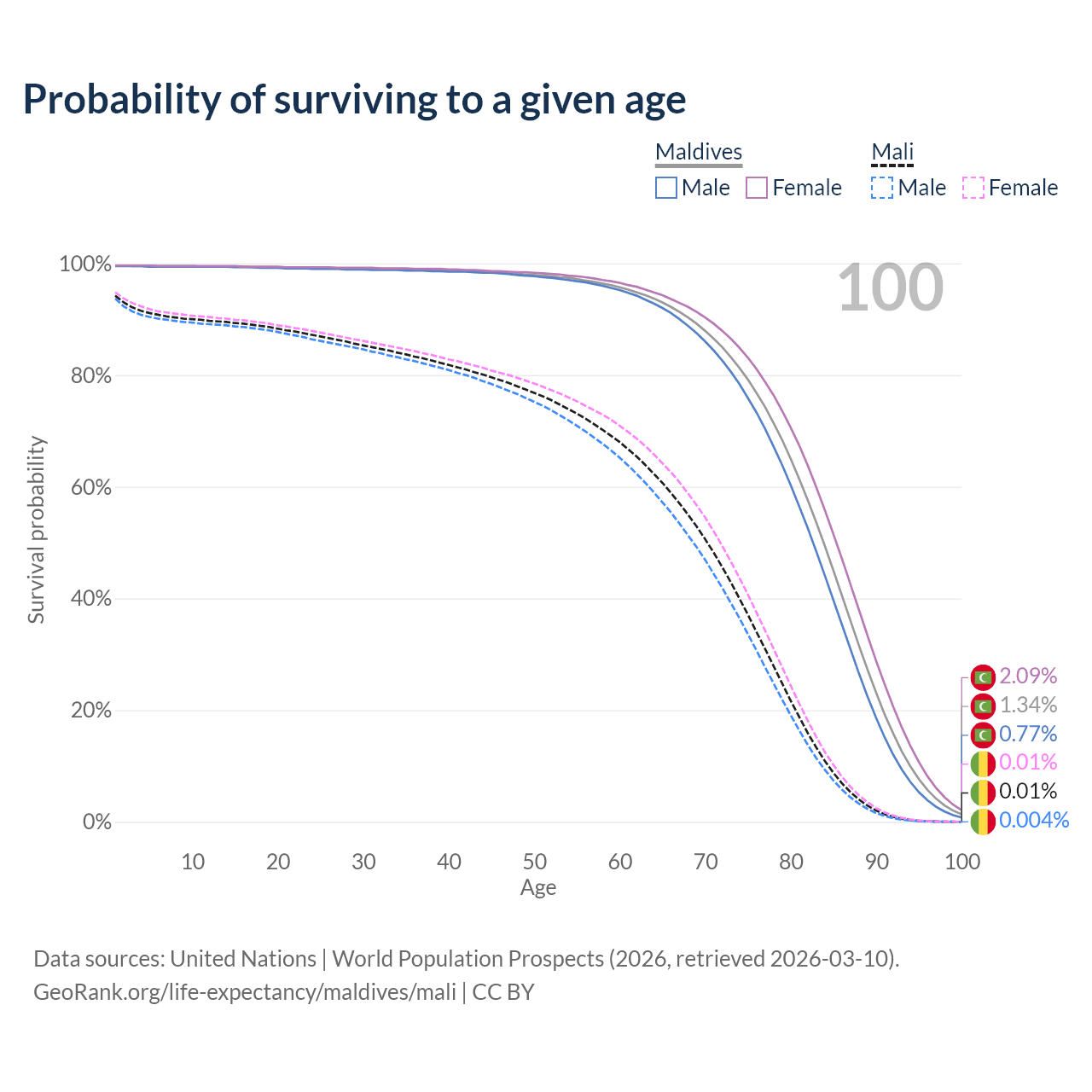 This life expectancy calculator shows the odds of living to 100, 95, 90, and below based on current age for both males and females in Maldives and Mali, along with mean and median age of death. The calculations are based on the 2026 life tables (actuarial tables) from the UN World Population Prospects.