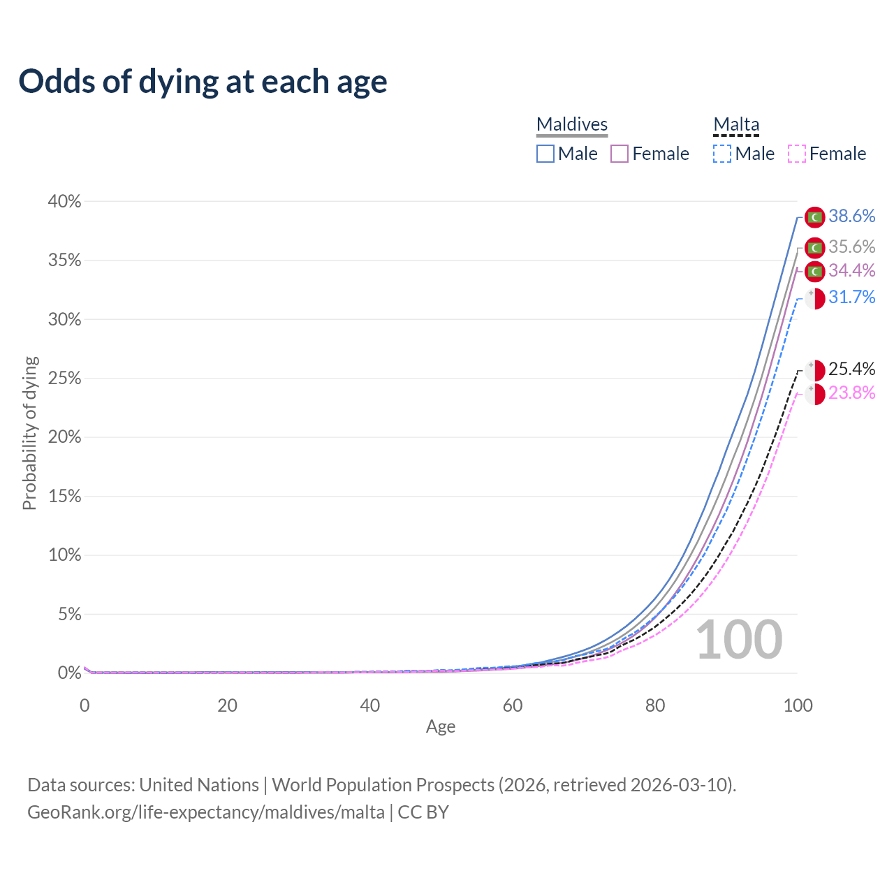 This life expectancy calculator shows the odds of living to 100, 95, 90, and below based on current age for both males and females in Maldives and Malta, along with mean and median age of death. The calculations are based on the 2026 life tables (actuarial tables) from the UN World Population Prospects.