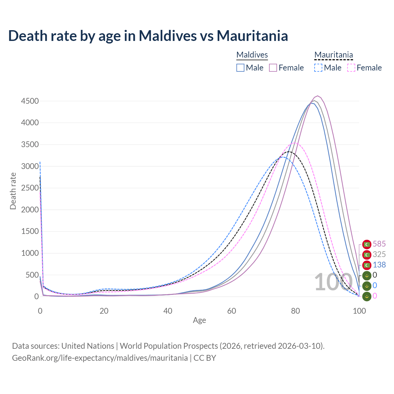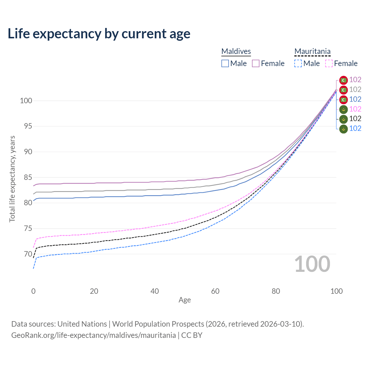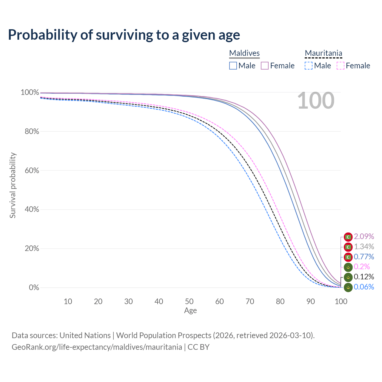 This life expectancy calculator shows the odds of living to 100, 95, 90, and below based on current age for both males and females in Maldives and Mauritania, along with mean and median age of death. The calculations are based on the 2026 life tables (actuarial tables) from the UN World Population Prospects.