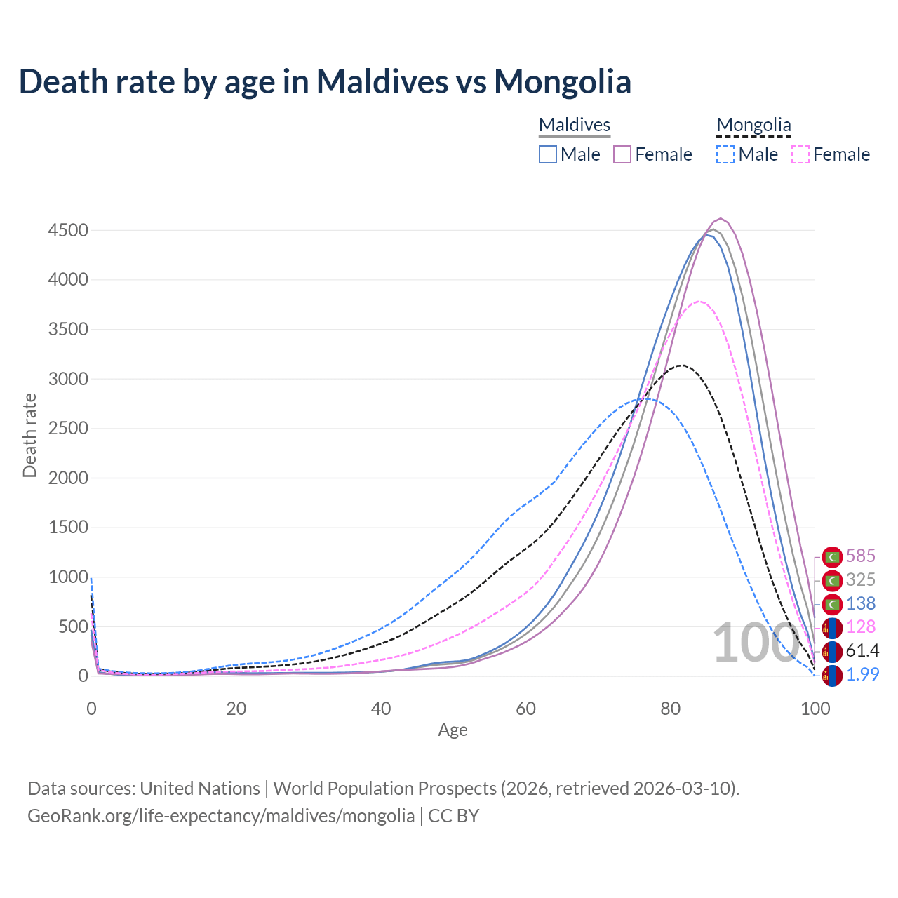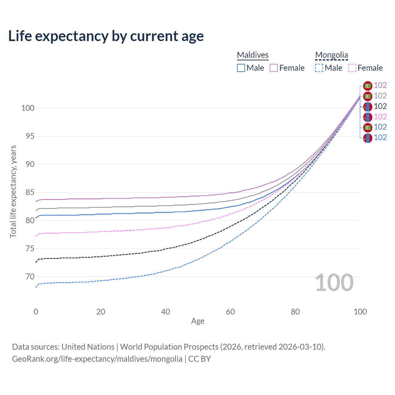 This life expectancy calculator shows the odds of living to 100, 95, 90, and below based on current age for both males and females in Maldives and Mongolia, along with mean and median age of death. The calculations are based on the 2026 life tables (actuarial tables) from the UN World Population Prospects.