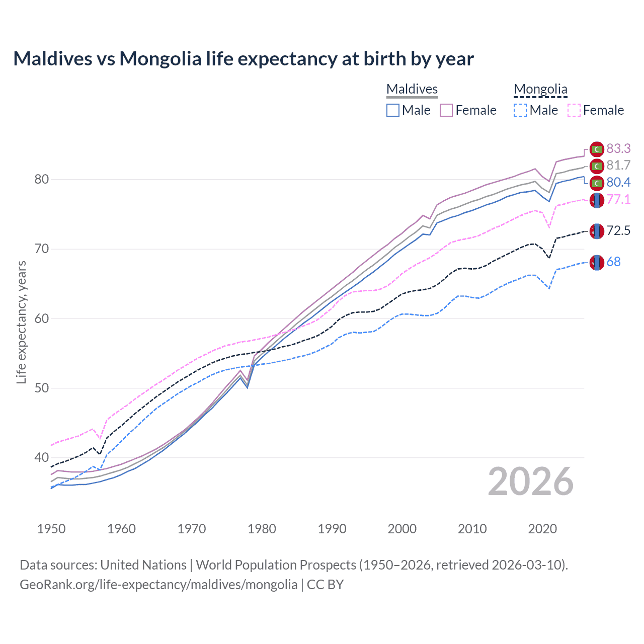 The average life expectancy at birth is 81.7 years in Maldives vs 72.5 in Mongolia. Maldives is ranked 37/197 by life expectancy, and Mongolia is 120/197. In Maldives, the life expectancy is 80.4 years for males and 83.3 years for females. In Mongolia, it's 68 years for males and 77.1 years for females.