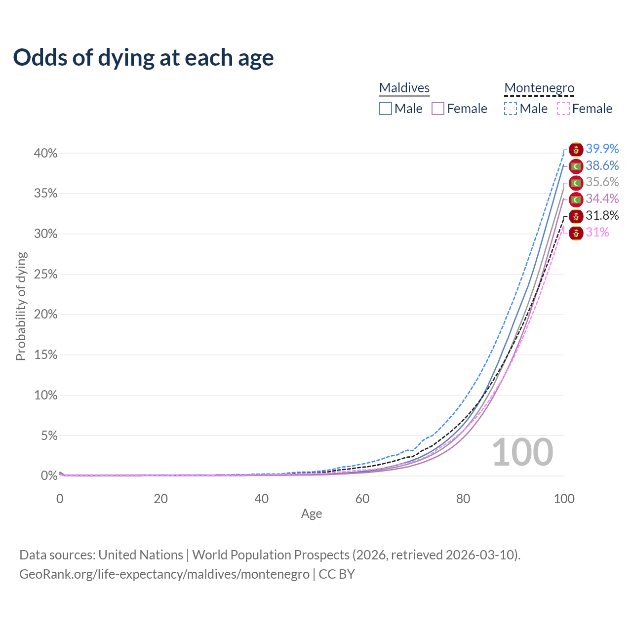 This life expectancy calculator shows the odds of living to 100, 95, 90, and below based on current age for both males and females in Maldives and Montenegro, along with mean and median age of death. The calculations are based on the 2026 life tables (actuarial tables) from the UN World Population Prospects.