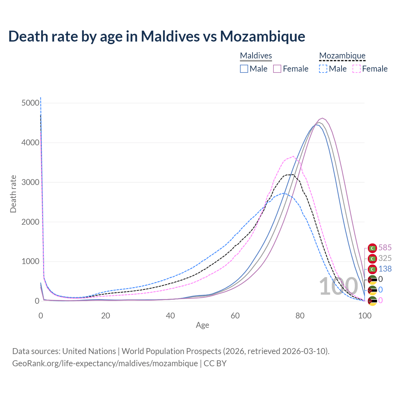 In Maldives, the most common age of death is 86, compared to 0 in Mozambique. The median age of death is 83.8 in Maldives and 71.2 in Mozambique, meaning only half of each cohort is expected to live past that age.