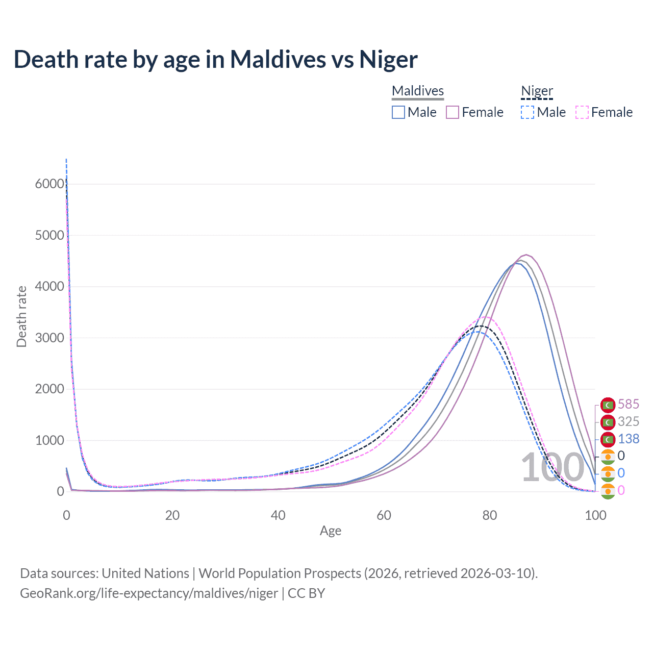 In Maldives, the most common age of death is 86, compared to 0 in Niger. The median age of death is 83.8 in Maldives and 71.7 in Niger, meaning only half of each cohort is expected to live past that age.