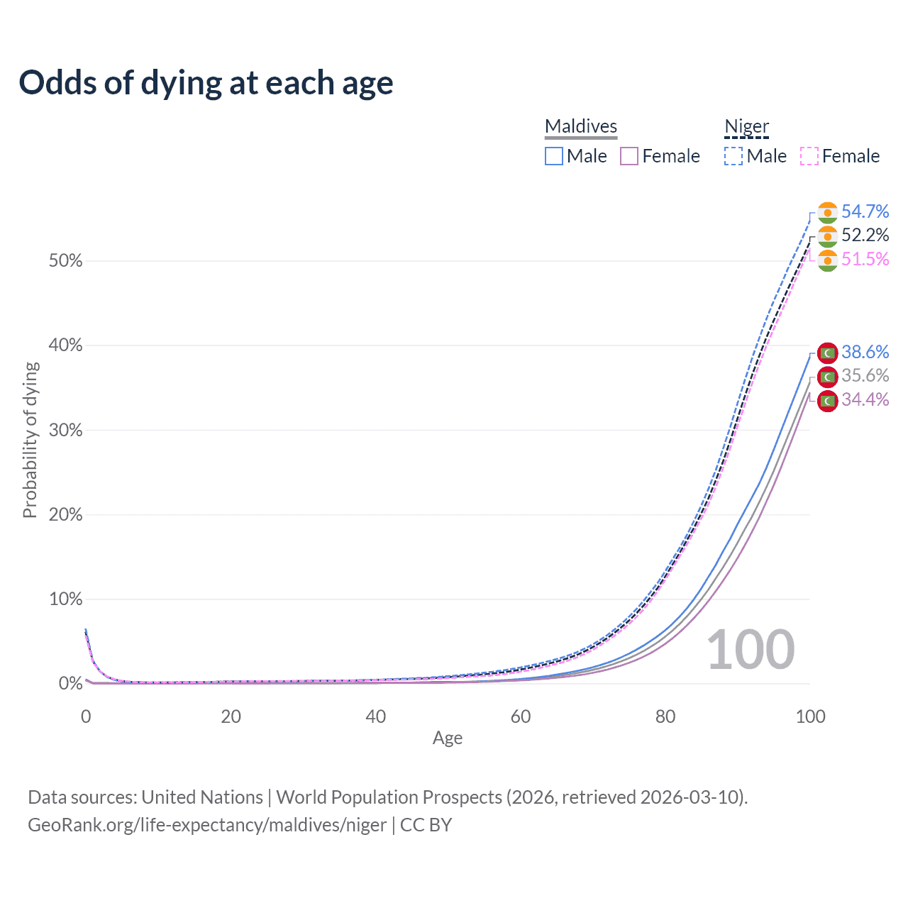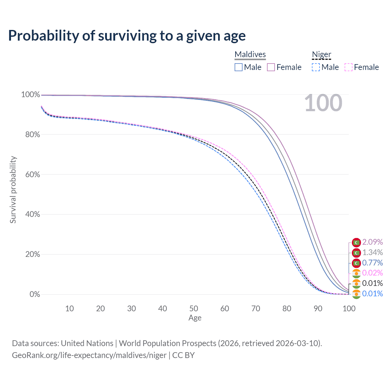 This life expectancy calculator shows the odds of living to 100, 95, 90, and below based on current age for both males and females in Maldives and Niger, along with mean and median age of death. The calculations are based on the 2026 life tables (actuarial tables) from the UN World Population Prospects.