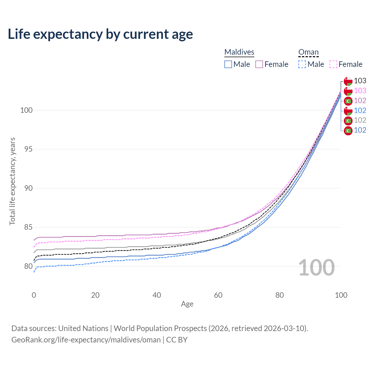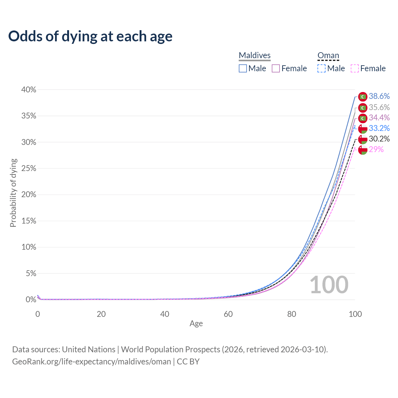 This life expectancy calculator shows the odds of living to 100, 95, 90, and below based on current age for both males and females in Maldives and Oman, along with mean and median age of death. The calculations are based on the 2026 life tables (actuarial tables) from the UN World Population Prospects.