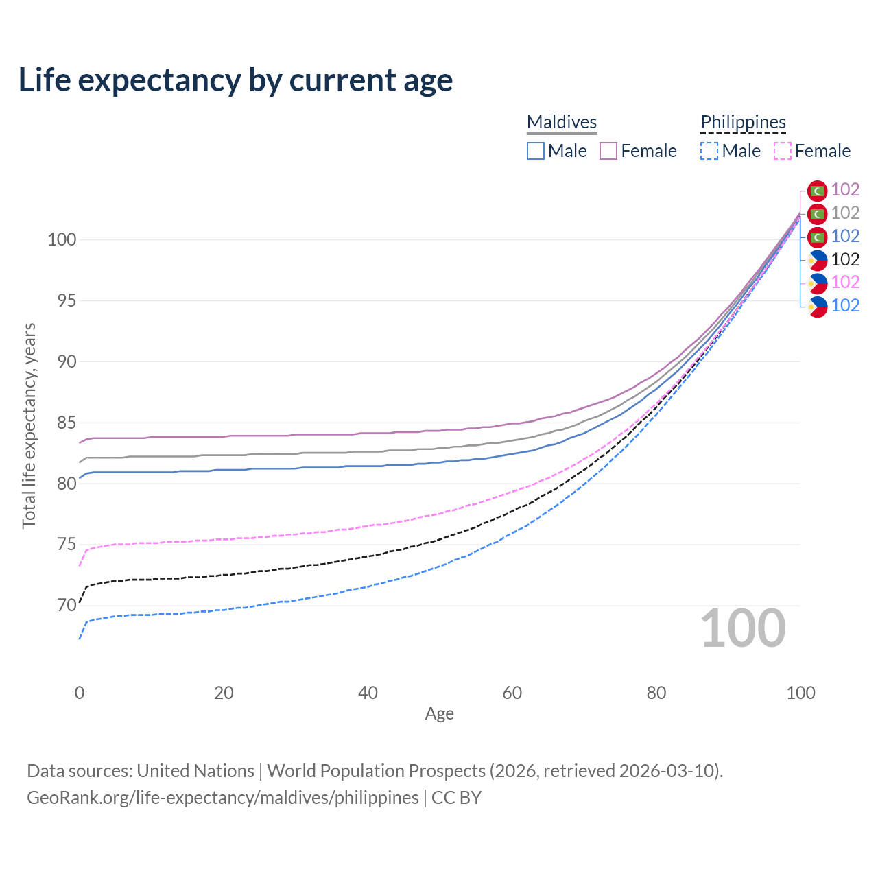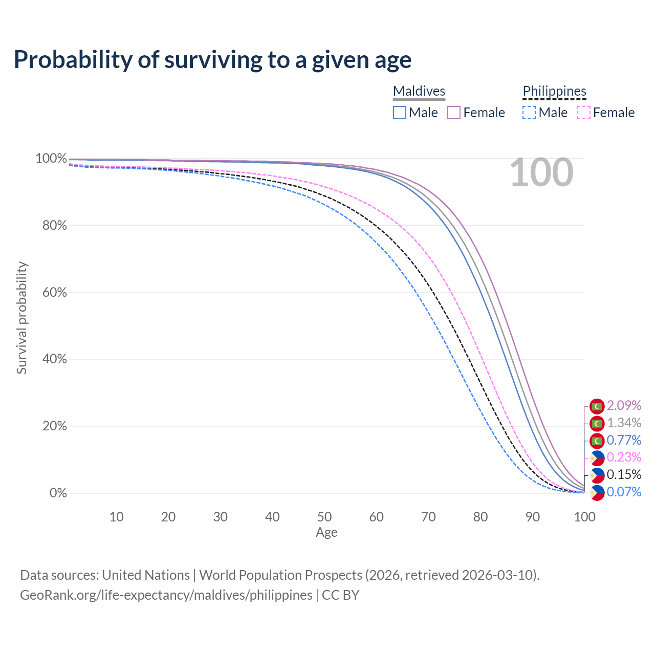 This life expectancy calculator shows the odds of living to 100, 95, 90, and below based on current age for both males and females in Maldives and the Philippines, along with mean and median age of death. The calculations are based on the 2026 life tables (actuarial tables) from the UN World Population Prospects.