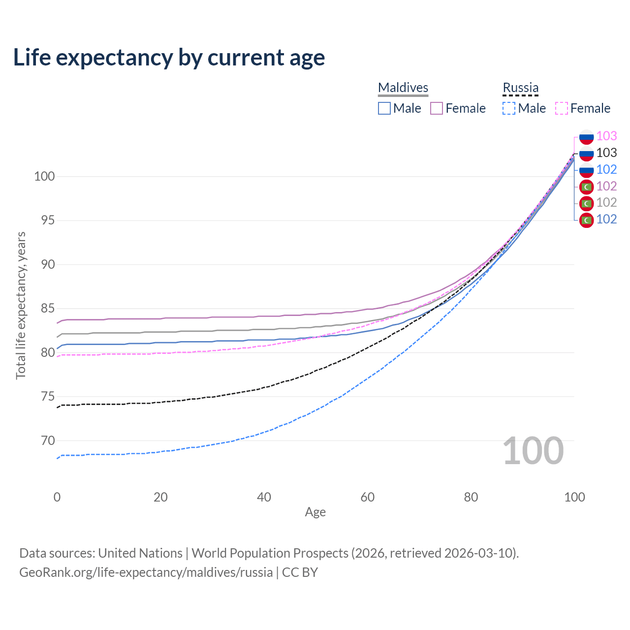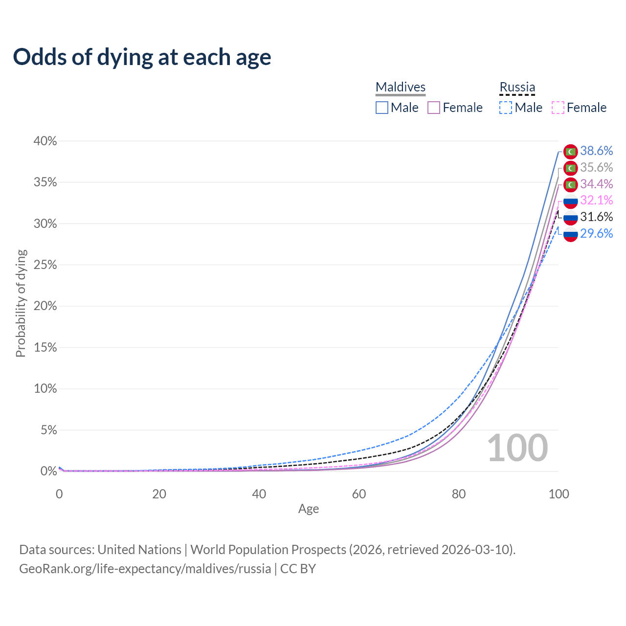 This life expectancy calculator shows the odds of living to 100, 95, 90, and below based on current age for both males and females in Maldives and Russia, along with mean and median age of death. The calculations are based on the 2026 life tables (actuarial tables) from the UN World Population Prospects.