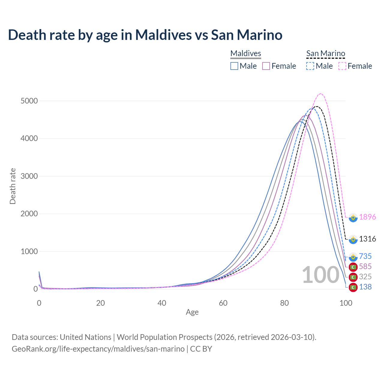 In Maldives, the most common age of death is 86, compared to 91 in San Marino. The median age of death is 83.8 in Maldives and 88.3 in San Marino, meaning only half of each cohort is expected to live past that age.