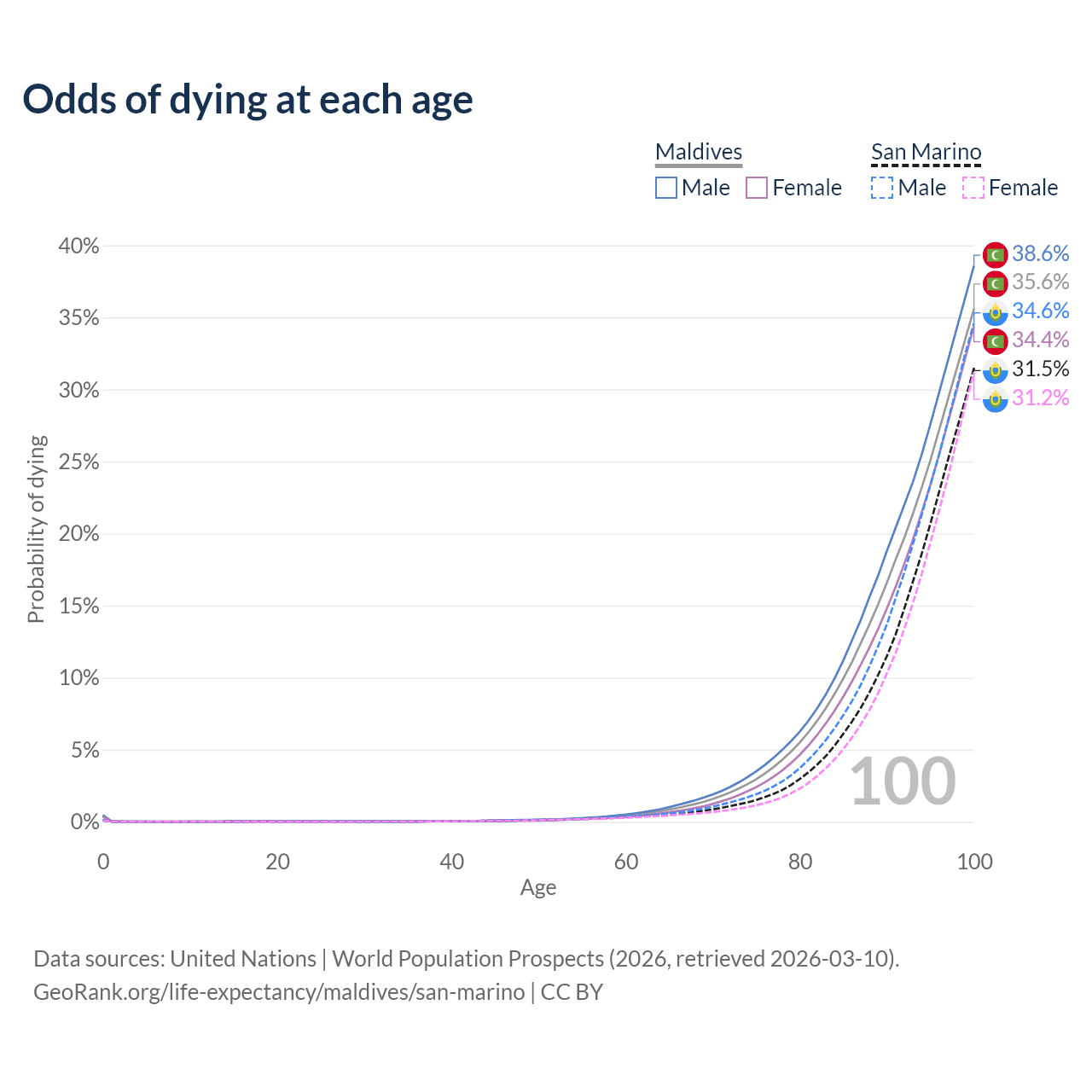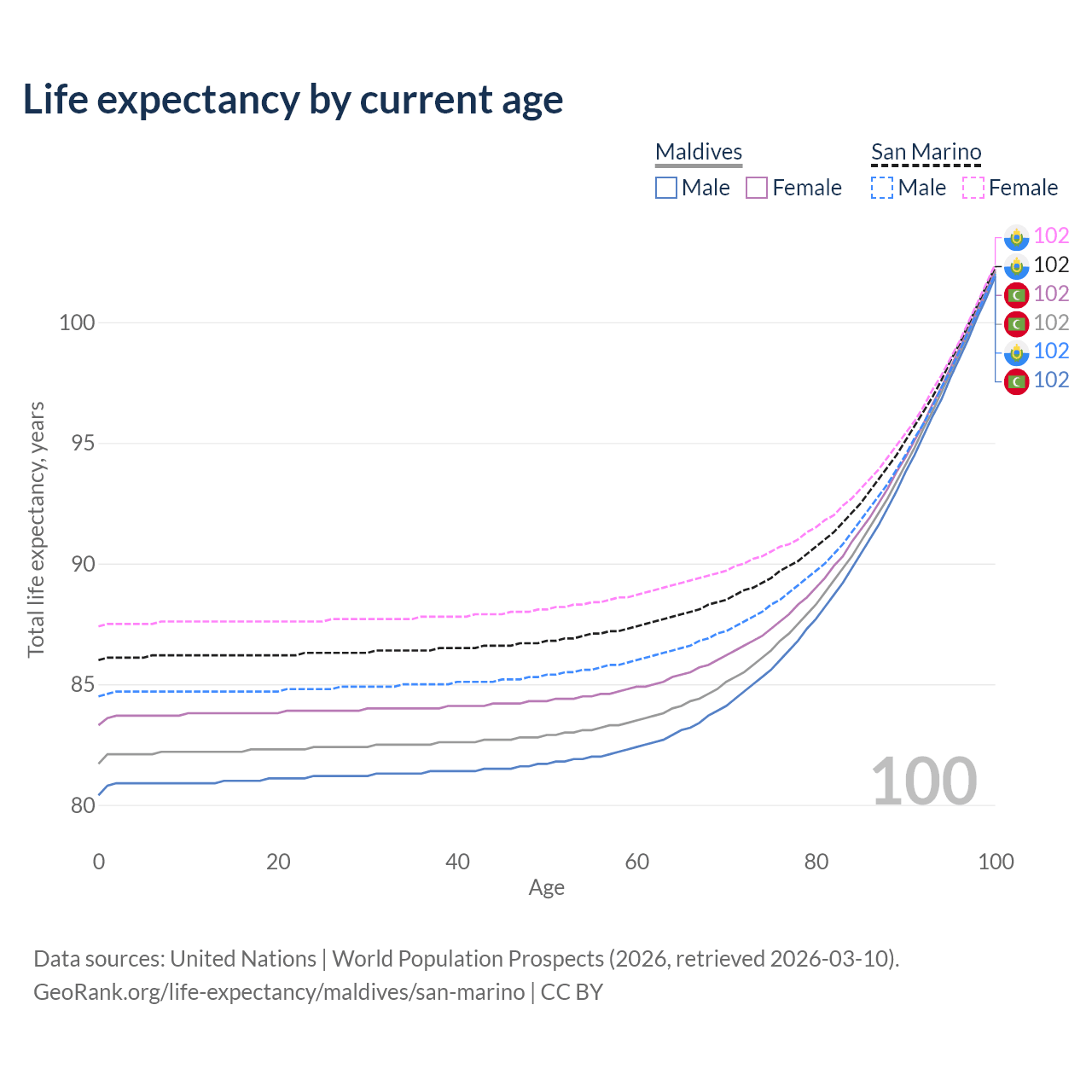 This life expectancy calculator shows the odds of living to 100, 95, 90, and below based on current age for both males and females in Maldives and San Marino, along with mean and median age of death. The calculations are based on the 2026 life tables (actuarial tables) from the UN World Population Prospects.