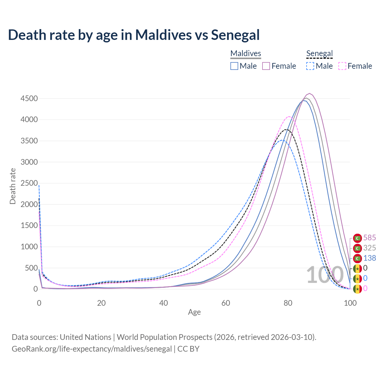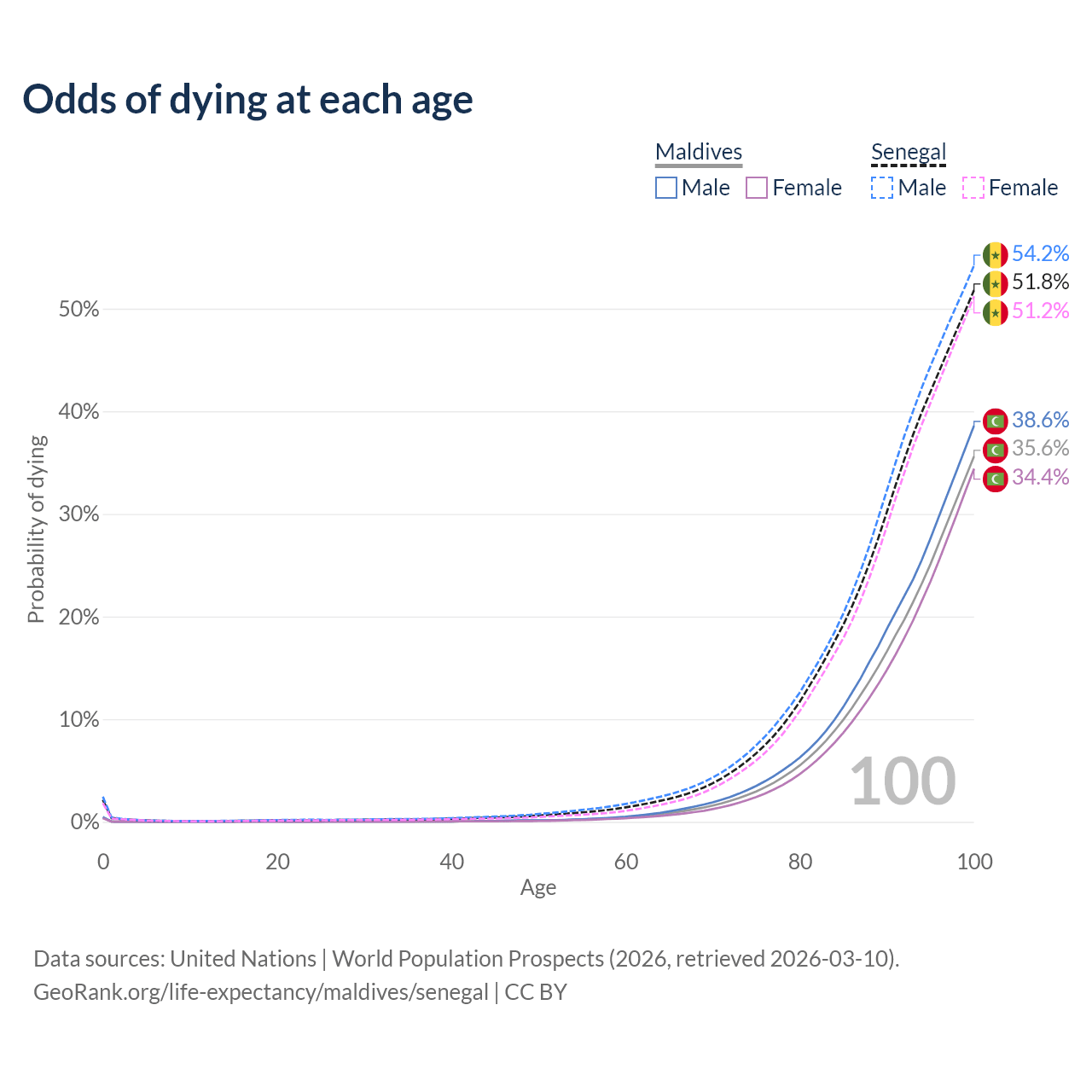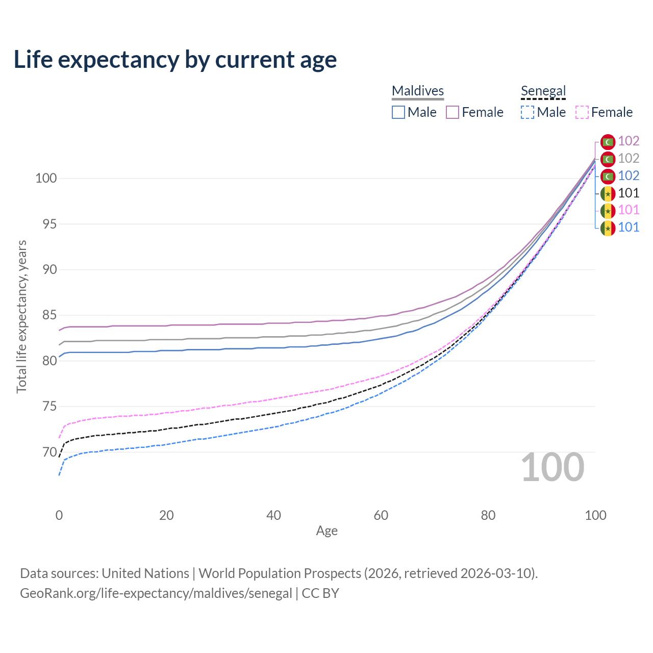 This life expectancy calculator shows the odds of living to 100, 95, 90, and below based on current age for both males and females in Maldives and Senegal, along with mean and median age of death. The calculations are based on the 2026 life tables (actuarial tables) from the UN World Population Prospects.
