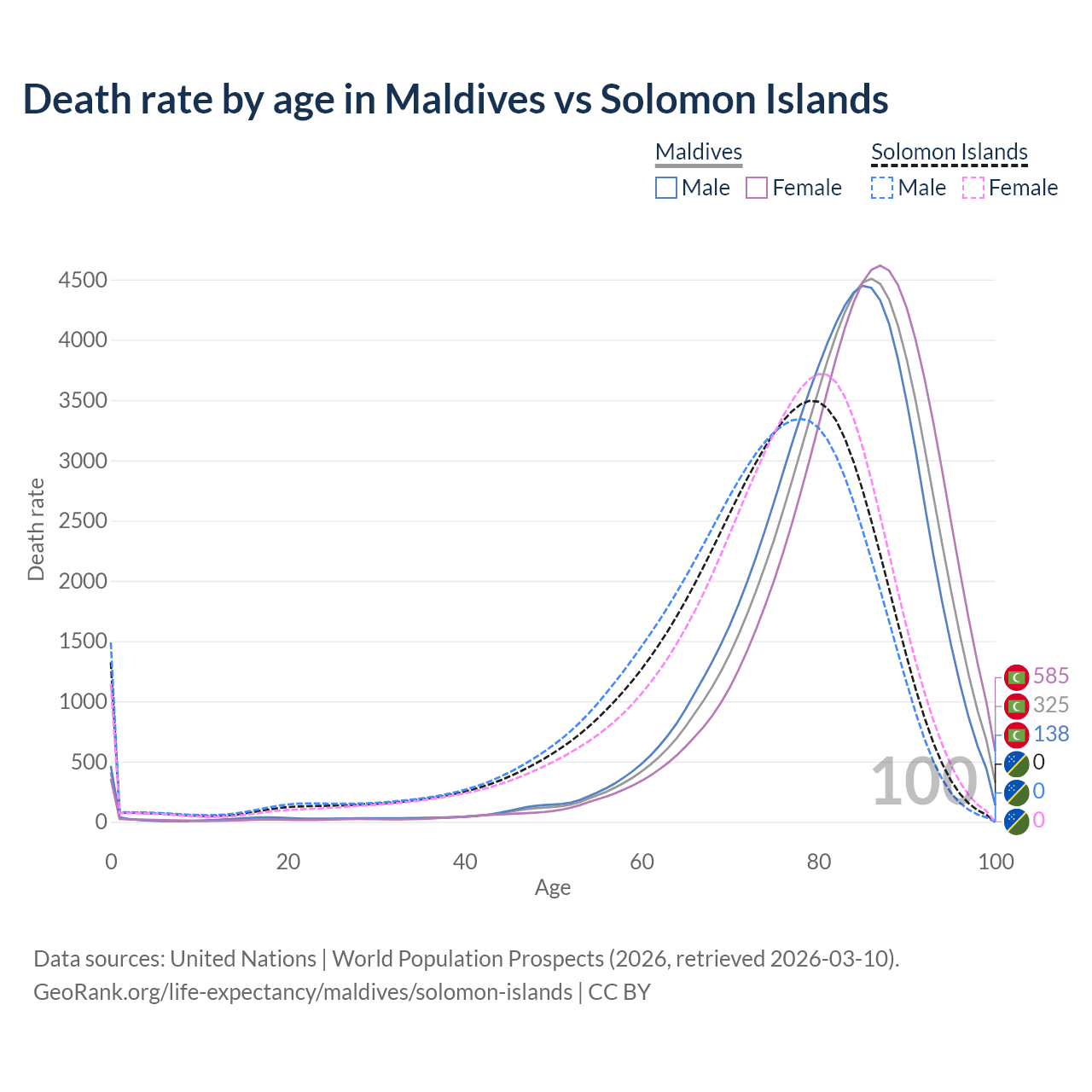 In Maldives, the most common age of death is 86, compared to 79 in the Solomon Islands. The median age of death is 83.8 in Maldives and 74.9 in the Solomon Islands, meaning only half of each cohort is expected to live past that age.
