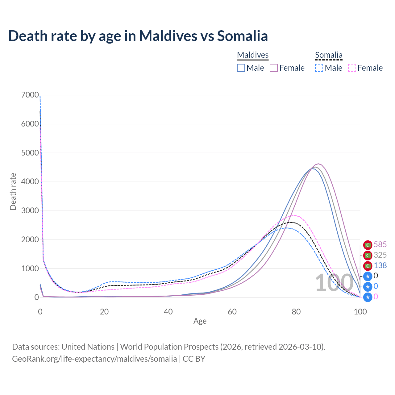 In Maldives, the most common age of death is 86, compared to 0 in Somalia. The median age of death is 83.8 in Maldives and 69 in Somalia, meaning only half of each cohort is expected to live past that age.
