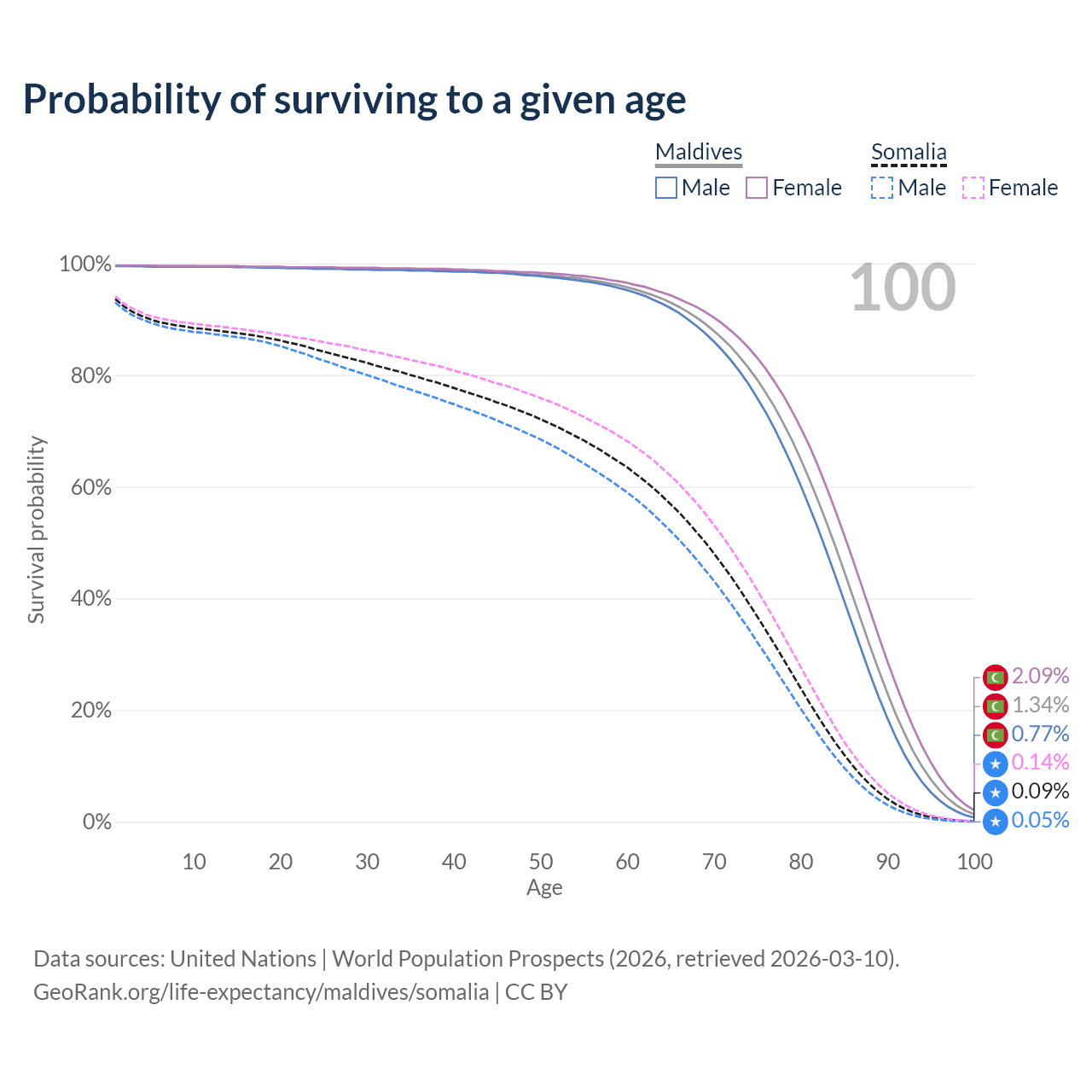 This life expectancy calculator shows the odds of living to 100, 95, 90, and below based on current age for both males and females in Maldives and Somalia, along with mean and median age of death. The calculations are based on the 2026 life tables (actuarial tables) from the UN World Population Prospects.