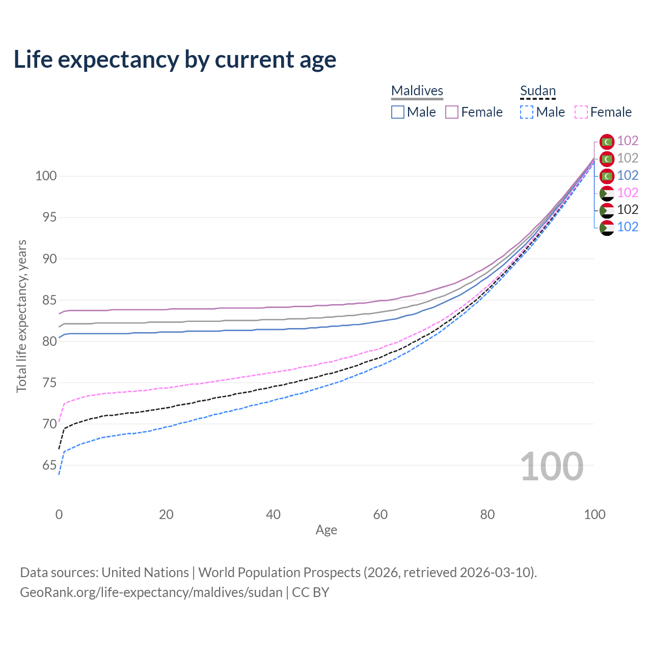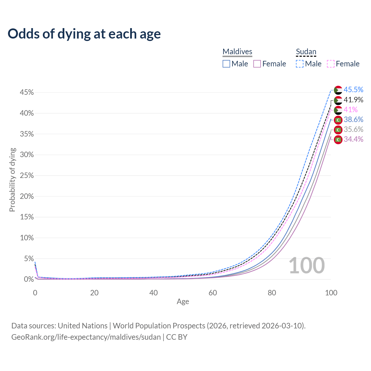 This life expectancy calculator shows the odds of living to 100, 95, 90, and below based on current age for both males and females in Maldives and Sudan, along with mean and median age of death. The calculations are based on the 2026 life tables (actuarial tables) from the UN World Population Prospects.
