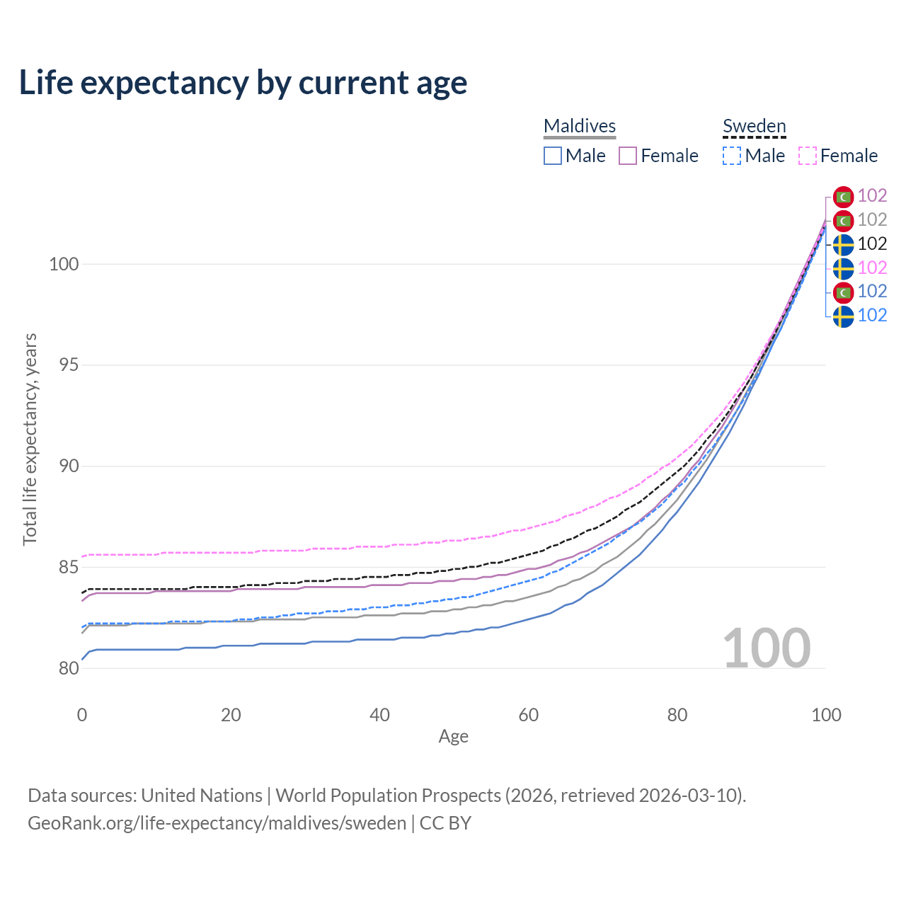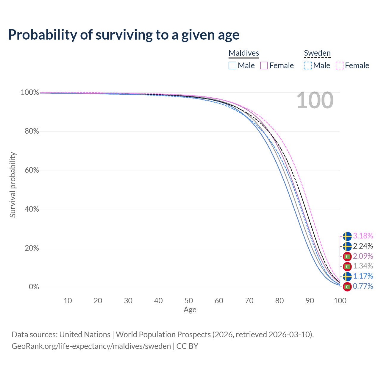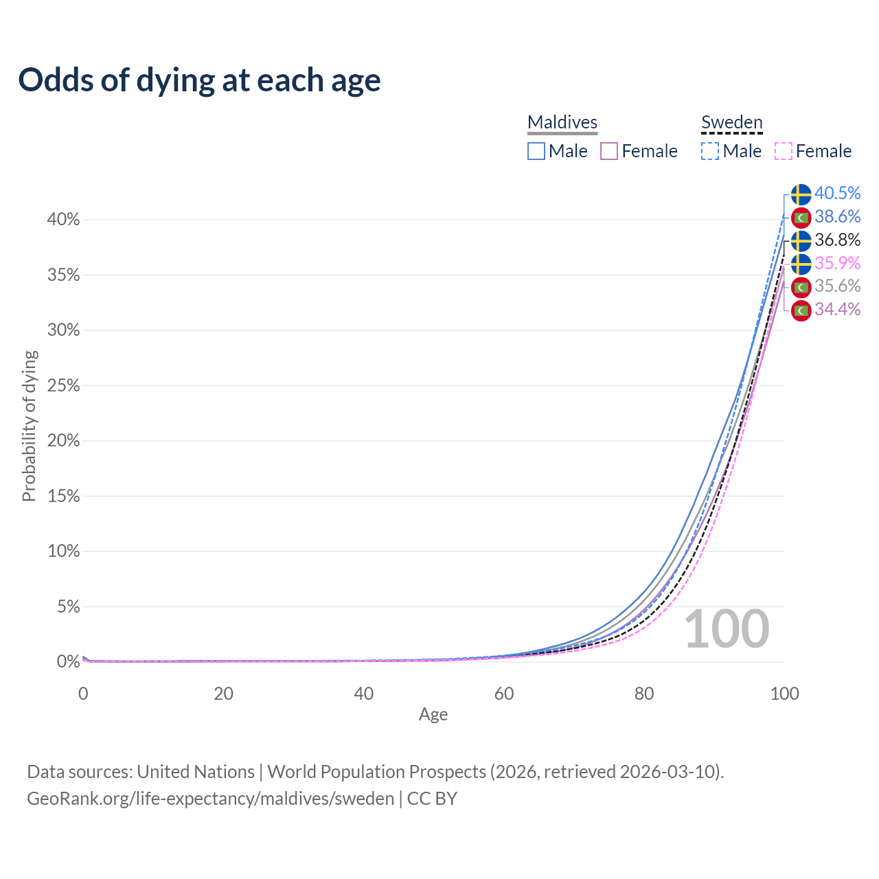 This life expectancy calculator shows the odds of living to 100, 95, 90, and below based on current age for both males and females in Maldives and Sweden, along with mean and median age of death. The calculations are based on the 2026 life tables (actuarial tables) from the UN World Population Prospects.