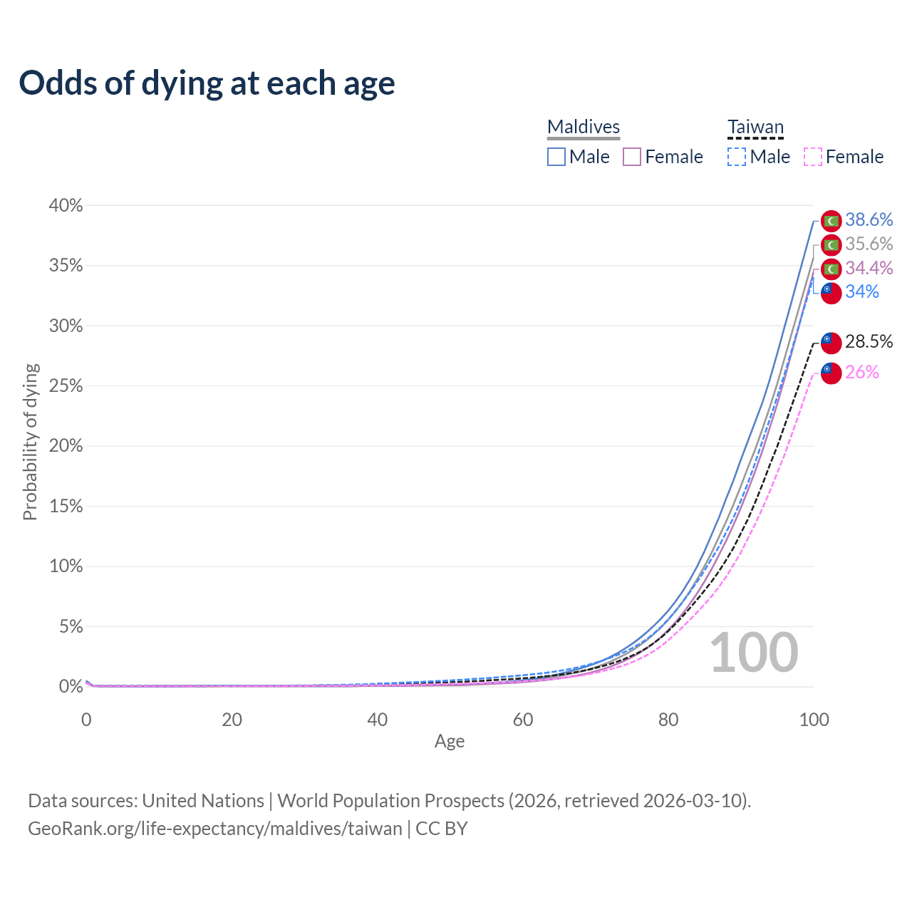 This life expectancy calculator shows the odds of living to 100, 95, 90, and below based on current age for both males and females in Maldives and Taiwan, along with mean and median age of death. The calculations are based on the 2026 life tables (actuarial tables) from the UN World Population Prospects.